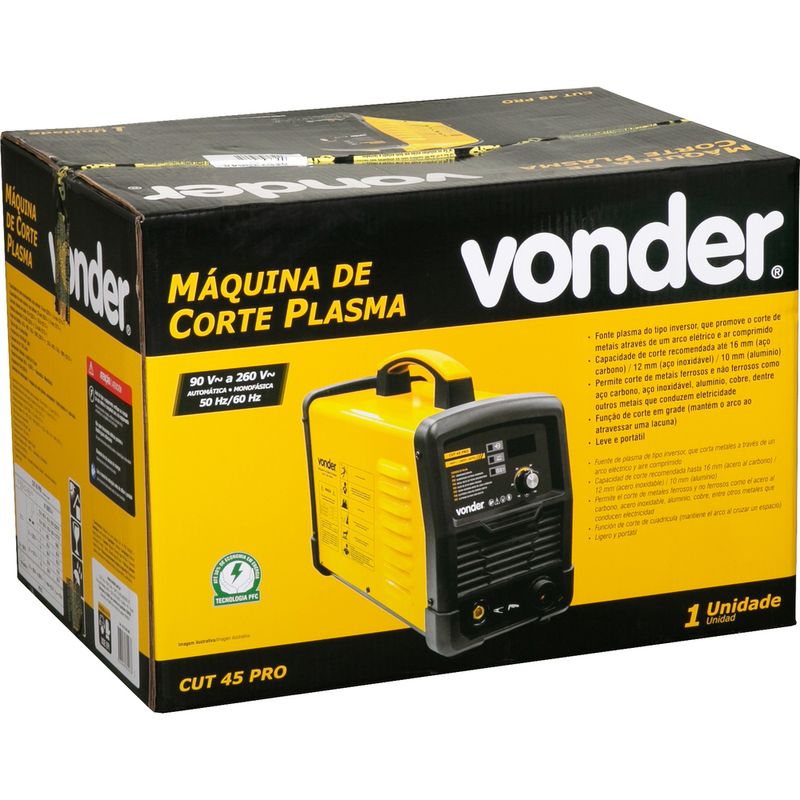 Ref. Fornecedor: 6878045000Marca: VonderConteúdo da Embalagem:1 Máquina de corte plasma. Acompanha: 1 tocha plasma TPV 66, 1 conjunto garra obra (cabo com engate rápido de 9 mm e garra obra) e 1 mangueira de arDestaques e diferenciais:Possui função de corte em grade (mantém o arco ao atravessar uma lacuna). Equipamento leve e portátil, com tecnologia PFC (Power Factor Correction - correção de fator de potência). A tecnologia PFC conta com vantagens como a redução em até 30% do consumo de energia comparado com equipamento sem tecnologia PFC | produção de menos ruídos e distorções na rede elétrica | operação em redes elétricas diferentes, em especial a rede rural, onde valores de tensão atingem valores acima de 250 V. Conta com fonte plasma do tipo inversor, que promove o corte de metais através de um arco elétrico e ar comprimido. Aplicações e dicas de uso:Indicada para corte de metais através de um arco elétrico e ar comprimido. Permite corte de metais ferrosos e não ferrosos como aço carbono, aço inox, alumínio, cobre, dentre outros metais que conduzem eletricidade. Compressor indicado acima de 10 pés. O ar deve ser limpo, seco e isento de óleo, devendo ser utilizado pelo menos 2 elementos filtrantes. Adquirir consumíveis de tocha sobressalentes: eletrodo (68.49.060.105), bico (68.49.060.103), bocal (68.49.060.102), anel difusor (68.49.060.104) e espaçador (68.49.060.101).Características Técnicas:Capacidade de corte: Aço carbono: 16 mm (220 V~) / 6 mm (127V~) / aço inox: 12 mm (220 V~) / alumínio: 10 mm (220V~) Capacidade de separação: Aço carbono: 28 mm (220 V~) / 10 mm (127 V~) Capacidade de perfuração: Aço carbono: 8 mm (220 V~) / 3 mm (127 V~) Corrente máxima de saída (A): 45 A (220 V~) / 20 A (127 V~) Potência absorvida (kVA): 5,5 kVA (220 V~) / 2,4 kVA (127 V~) Fator de trabalho: 45 A - 40% / 30 A -100% (220 V~) / 20 A - 40%/ 14 A - 100% (127 V~) Tipo de gás indicado para conexão (utilização): Ar comprimido Pressão de ar: 90 lbf/pol² (psi) Consumo de ar: 150 L/min Tensão de entrada (V): 90 V~ a 260 V~ Automática - monofásica Tensão em vazio: DC - 320 V Corrente de entrada (A): 25 A (220 V~) / 19 A (127 V~) Frequência: 50 Hz/60 Hz Índice de proteção (IP): IP21S Dimensões (C x L x A): 420 mm x 190 mm x 310 mm Massa aproximada(Kg): 10 kg