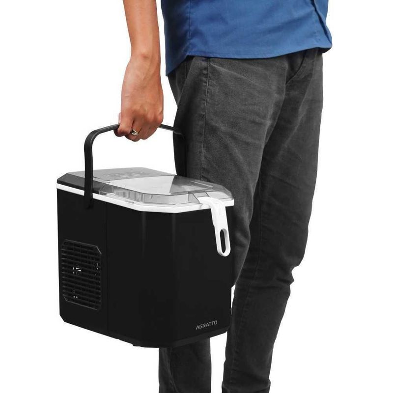 Máquina De Gelo 12 Kg/Dia MG-02 220V AgrattoDESCRIÇÃO DO PRODUTO:- A máquina de gelo Agratto tem alta capacidade e produz até 12kg de gelo por dia;- 2 tamanhos de gelo, faz tanto cubos de gelo pequenos, quanto grandes;- Sensor de cesta cheia: Possui sensor que avisa quando a cesta de gelo está cheia;- Gelo pronto em 6 min (tempo aproximado para cubos de gelo pequeno;- Função de auto limpeza, tornando a utilização muito mais prática;- Design black agregando elegância e sofisticação ao seu ambiente;- Tampa transparente: Com design moderno, você poderá acompanhar com facilidade e praticidade o processo de fabricação do gelo;- Com alça de transporte, proporcionando facilidade e agilidade para poder levar onde desejar;- Com saída de ar lateral para que o ar quente do compressor saia, prolongando a vida útil do produto;- Com gás refrigerante ecológico Eco Friendly;- Acompanha cesto removível e pá para facilitar a retirada do gelo.ESPECIFICAÇÕES:- Modelo: MG-02;- Medidas do produto (CxLxA): 310x250x320 mm;- Potência: 100W;- Frequência 60 Hz;- Capacidade total: 12kg/dia;- Tensão: 220V. Modelo: MG-02 | Voltagem: 220V