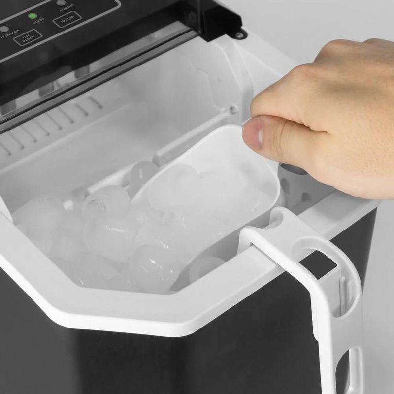 Máquina De Gelo 12kg MG-02 100W Preta Agratto 220VGelo pronto em 6min.Tempo aproximado para o ciclo de gelos pequenos.12kg de gelo por diaA máquina de gelo Agratto tem alta capacidade e produz até 12kg de gelo por dia.2 Tamanhos de geloFaz tanto cubos de gelo pequenos, quanto grandes.Sensor de cesta cheiaPossui um sensor que avisa quando a cesta de gelo está cheia.Auto limpezaFunção de auto limpeza, tornando a utilização muito mais prática.Design BlackAgregando elegância e sofisticação na decoração do seu ambiente.Tampa transparenteCom design moderno, você poderá acompanhar o processo de fabricação do gelo.Fácil de usarA Máquina de Gelo Agratto é fácil e intuitiva de utilizar. Acesso facilitado com as funções na parte superior.Simples e prática de transportarCom alça de transporte, proporcionando facilidade e agilidade para poder levar para onde desejar.Saída de ArConta com saída de ar lateral para que o ar quente do compressor saia, prolongando a vida útil do produto.Dimensões:Altura: 29,4 cmLargura: 32cmComprimento: 29 cmPeso: 7 kgCaracterísticas:Tensão: 220VPotência: 100WFrequência: 60hzGarantia 12 meses*Modelo: MG-02 | model_number: MG-02 | Capacidade: 12KG | Potência: 100W | Voltagem: 220V | Cor: Preto | Fabricante: Agratto | Última Compra: 27/11/2025