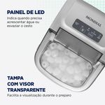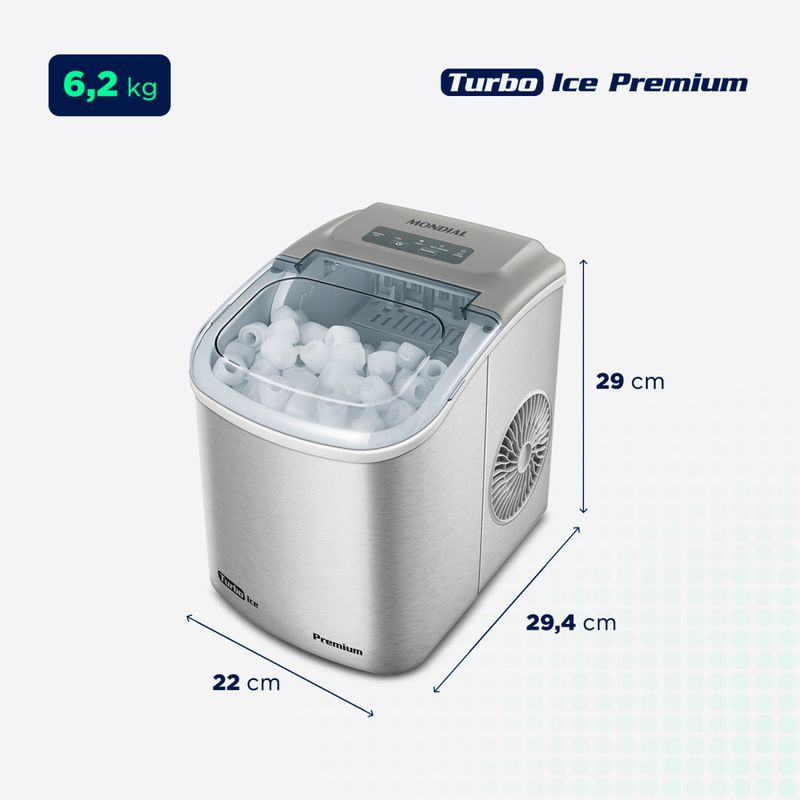 A Máquina de Gelo Turbo Ice Premium é garantia de praticidade e sofisticação na produção de gelo. Com capacidade de produzir até 12 kg por dia, ela é perfeita para deixar bebidas e drinks refrescantes no almoço de família, churrasco com amigos e até na rotina diária nos dias mais quentes. Possui design moderno e dispensa instalação hidráulica, preparando gelo com facilidade em menos de 10 minutos. Saiba mais sobre a MG-12-GI da Mondial: ALTA CAPACIDADE - 12 KG POR DIA: A máquina de gelo Mondial tem capacidade de produção diária de até 12 quilos. Dê adeus à preocupação se encheram a forminha de gelo ou não! GELO EM 8 MINUTOS: Produz 9 cubos a cada ciclo de 8* minutos. Incrível, né? Produza gelo de forma superágil! *O tempo de preparo pode variar dependendo das condições do ambiente e temperatura da água. 2 TAMANHOS DE GELO: Antes de iniciar o ciclo, selecione entre cubos pequenos ou grandes. RESERVATÓRIO DE ÁGUA: Possui reservatório de água com capacidade de 1,3 litros. Garantia de bebidas geladas a hora que desejar e em qualquer lugar! PAINEL DIGITAL + INDICADOR DE FUNCIONAMENTO: O painel digital possui uma operação intuitiva e é fácil de utilizar. Além disso, o painel possui indicador para acrescentar água ou para esvaziar o cesto de gelo. FÁCIL OPERAÇÃO: Esqueça as complicações com instalação hidráulica! A máquina de gelo da Mondial foi pensada para ser prática: basta conectá-la a uma fonte de energia elétrica e adicionar água no reservatório para garantir gelo fresco e abundante sempre que quiser. DESIGN COMPACTO E PORTÁTIL: Não ocupa muito espaço e é fácil de guardar. Além disso, é fácil de levar onde quiser e combina com qualquer ambiente! TAMPA COM VISOR TRANSPARENTE: Facilita a visualização durante o preparo. Você não precisa ficar abrindo a tampa para verificar o andamento da produção do gelo. VÁLVULA PARA SAÍDA DE ÁGUA: Promove o escoamento da água, facilitando ainda mais a utilização da máquina. MARCAS DE DEDO NUNCA MAIS: A máquina de gelo Mondial tem um acabamento Premium que não deixa marcas visíveis de dedos após o manuseio. A sensação é que sua máquina está sempre limpa! ACESSÓRIOS: Acompanha cesto e pá para facilitar a retirada do gelo. UM ANO DE GARANTIA MONDIAL: A Mondial é a escolha de milhões de consumidores. Mondial, a escolha inteligente!