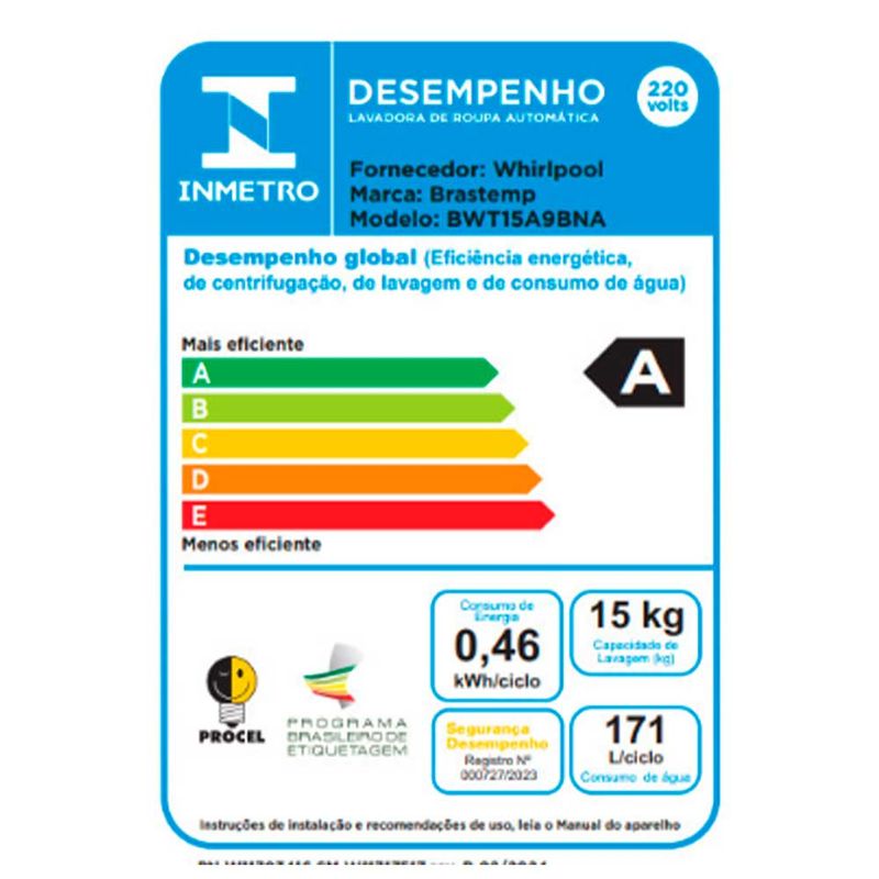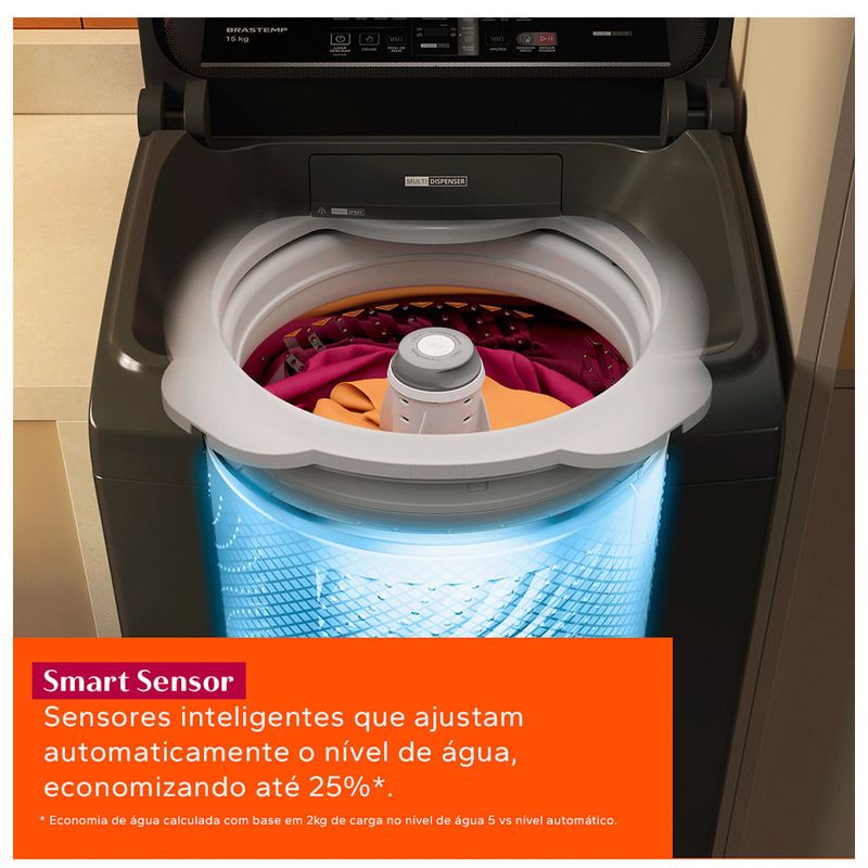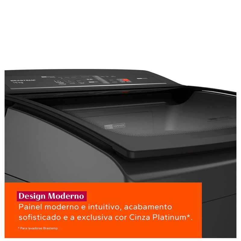 A nova Máquina de Lavar Brastemp 15kg conta com Design moderno e intuitivo, além do Timer no painel que mostra a duração do ciclo[1] e Aviso Sonoro quando termina. E, para o máxima performance, o Ciclo Tira Manchas Advanced que remove mais de 40 tipos de manchas[2] como gordura, canetinha e desodorante, entre outras, sem danificar os tecidos. CaracterísticasTipo: Lavadora de RoupasCapacidade de Lavagem: 15 kgAbertura: Top LoadProgramas de Lavagem: 4 programasNível automático de ÁguaOpções de Centrifugação: CentrifugaVelocidade de Centrifugação: 700RpmFiltro Elimina FiaposDispenser Sabão Dispenser Amaciante Dispenser AlvejanteFuncionamento: Elétrica Especificações TécnicasModelo: BWT15A9Cor: CinzaConsumo de Água: 171 LSelo Procel (Eficiência Energética): AVoltagem: 110V e 220V (não é bivolt)EAN: 7891129576278 (110V) / 7891129576285 (220V)Garantia: 12 meses Dimensões e PesoDimensões do produto sem embalagem (AxLxP): 1070x630x710 mmDimensões do produto com embalagem (AxLxP): 1070x670x720 mmPeso do produto sem embalagem: 40,0 KgPeso do produto com embalagem: 41,5 Kg Itens Inclusos01 Lavadora de RoupasGuia RápidoManual Serviço de Instalação e Orientação de UsoPara sua comodidade e segurança, a Fast Shop dispõe do serviço de Instalação e Orientação de Uso*. Agendamos o serviço para você, executamos a instalação com equipes próprias especializadas e autorizadas pelo fabricante, ensinamos como utilizar os produtos da melhor forma e temos uma área de qualidade para acompanhar e garantir que tudo dê certo. É rápido e fácil.Você pode contratar o serviço com o nosso canal Blá pelo WhatsApp no número (11) 3232-2949 ou em uma de nossas lojas. Consulte os valores e regiões atendidas.