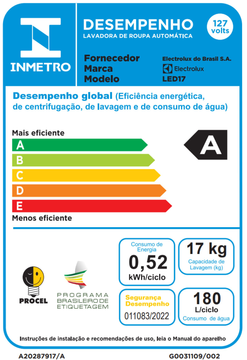 A Máquina de Lavar 17kg Electrolux Essential Care com Cesto Inox , exclusivo dispenser Jet&Clean e Ultra Filter (LED17) foi projetada especialmente para facilitar sua rotina em casa e oferecer maiores cuidados para as roupas, que nos protegem e acompanham em diversas situações e também mostram nossa personalidade, por isso merecem todo o cuidado especial que a linha Essential Care oferece. Esta lavadora conta com exclusiva tecnologia Jet&Clean, que aplica fortes jatos de água no dispenser, diluindo até 100%¹ do sabão e do amaciante no momento correto da lavagem, para que os insumos penetrem os tecidos de forma homogênea, evitando manchas e relavagens. E além disso, entrega também a auto limpeza do dispenser, mantendo-o sempre limpo e pronto para o próximo ciclo de lavagem. O novo Ultra Filter Pega Fiapos da LED17 possui capacidade de retenção 8 vezes² maior, evitando que você se preocupe com os fiapos e sujeiras que possam ficar presos nas roupas após o ciclo de lavagem, proporcionando ainda mais cuidados com suas roupas. Maior lavadora Top Load com agitador do mercado³, com apenas 66,2 cm de largura, você poderá lavar até 17Kg de roupas por ciclo de lavagem. Lave as roupas de toda a família em um único ciclo! Maior praticidade no seu dia a dia. O sistema de lavagem Ciclos Rápidos otimiza automaticamente o tempo dos programas, deixa-os mais rápidos quando necessário sem comprometer a alta performance, evitando assim, o desgaste dos tecidos de suas roupas. O Cesto Inox entrega um design mais sofisticado e combinado com a função de auto limpeza do cesto da Máquina de lavar roupa LED17, evita que resíduos de outras lavagens se acumulem no seu interior, entregando ciclos cada vez mais efetivos. A nova linha de máquina de lavar Essential Care Electrolux foi desenvolvida com funções essenciais e tecnologias exclusivas que proporcionam um ótimo resultado de limpeza, cuidado com as roupas e possibilita o reuso e a economia da água através do reaproveitamento para outros fins, como por exemplo, lavar o chão, devido a Função Reutilização de água. Descubra um novo jeito de cuidar das suas roupas de forma econômica e sustentável com a Máquina de lavar 17kg Electrolux LED17. 1Teste comparativo interno realizado com a LT10B (sem Jet&Clean), verificando a distribuição dos insumos líquidos na carga de roupa mais próxima ao fundo do cesto, segundo testes internos da Electrolux. Área atingida pelo amaciante de 99,99% e desvio padrão 0,01 ²O maior volume interno do filtro pode armazenar até 8 vezes mais fiapos. Este produto possui filtro com volume interno 8 vezes maior quando comparado ao volume interno do filtro do produto LT12F, segundo procedimento interno em laboratório da Electrolux. ³Conforme produtos listados na tabela PBE - LAVADORAS DE ROUPAS AUTOMÁTICAS ABERTURA SUPERIOR (TOP LOAD) do Inmetro da data de 10/04/2021 , no disponível no site: Inmetro . gov . br / consumidor / tabelas.asp