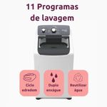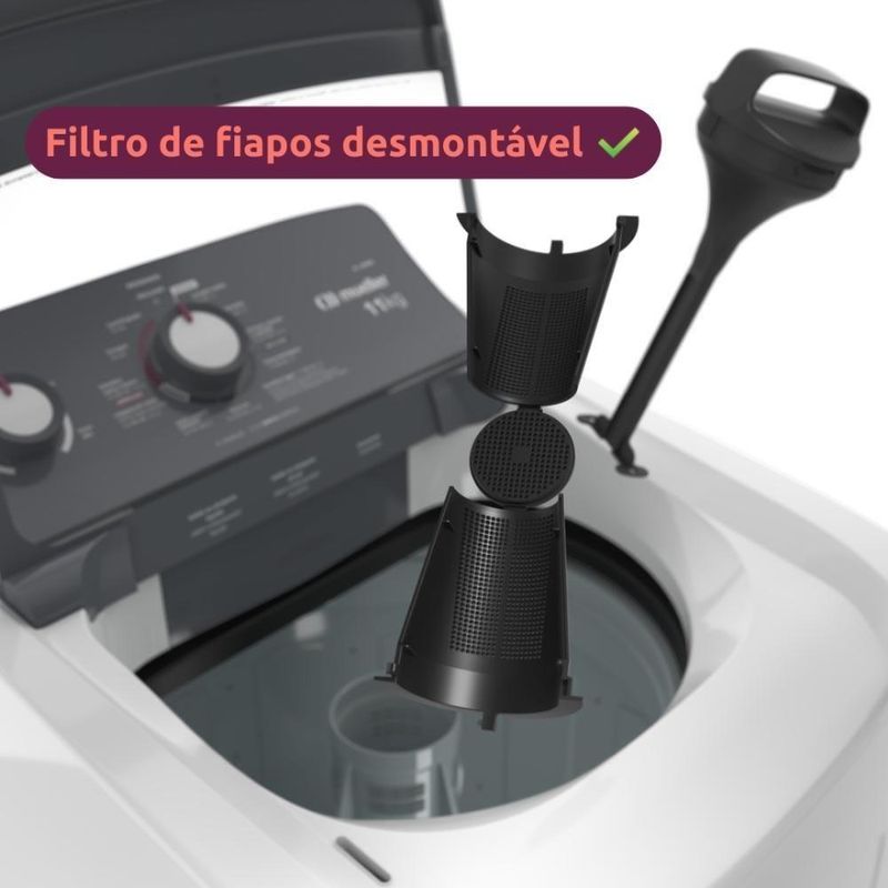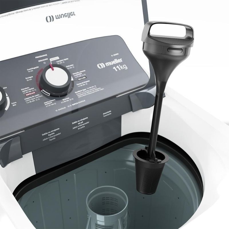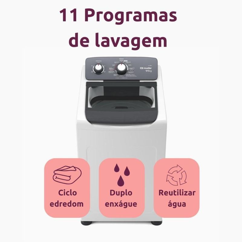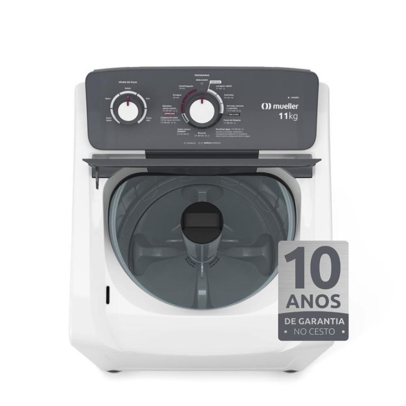 Máquina De Lavar Mueller Automática 11kg MLA11 110V BrancoSaia do automático com a nova Lavadora Automática Mueller!Com alta capacidade e robustez, combinando eficiência de lavagem e o poder da dupla centrifugação, a Lavadora Automática Mueller 11kg foi projetada para garantir durabilidade e praticidade. Uma verdadeira experiência de cuidado com as roupas.O modelo possui 11 programas de lavagem, com 5 níveis de água, além de funções como o ciclo rápido de lavagem e programas de duplo enxágue para lavagem de edredom e cama/banho.Conheça os detalhes:Triplo Dispenser: Praticidade na medida certa para sabão em pó ou sabão líquido, amaciante e alvejante.5 Níveis de Água: Garanta eficiência máxima no consumo.Filtro de Fiapos Desmontável: Fácil de limpar e desmontar.11 Programas de Lavagem: Incluindo ciclo de lavagem rápida, com roupas limpas em até 27 minutos.Painel Ergonômico: Mais intuitivo e prático de usar, com o maior botão da categoria emborrachado.Lavagem Econômica e Sustentável: Eficiência Global “A” e ciclo de reaproveitamento de água, garantindo economia e sustentabilidade no dia a dia.Especificações TécnicasModelo: Lavadora 11Kg MLA11Tipo: Lavadora AutomáticaCor: BrancoAbertura: SuperiorAutoaquecimento da Água: NãoCesto Removível: NãoDesmontável: NãoSistema de Lavagem: AgitaçãoNíveis de Água: 5Número de Programas: 11Tampa Transparente: SimCentrifugação: 690 rpmEnxágue: AutomáticoEnxágue Extra: NãoEsfregador: NãoFiltro para Fiapos: No agitadorFunção Apenas Centrifugar: SimEntrada de Água: AutomáticaSaída de Água: Automática – com sistema de reaproveitamento de águaEngates para Mangueira: SimMangueira de Entrada de Água: SimLava Edredom: Casal SoftDispenser para Alvejante: SimDispenser para Amaciante: SimDispenser para Sabão: SimGabinete: MetalGrade de Proteção no Motor: SimMotor com Protetor Térmico: SimPés: ReguláveisConsumo de Energia – Ciclo Normal Água Fria: 0,32 kW/hConsumo de Água por Ciclo: 140 litrosPotência 127V: 850 wattsPotência 220V: 750 wattsClassificação de Eficiência Energética: AEficiência de Lavagem: 0,88Altura: 106 cmLargura: 59,5 cmProfundidade: 65 cmPeso: 34 kgCapacidade: 11 kgCapacidade de Lavagem: 11 kgCapacidade de Secagem: 0 kgCapacidade de Água na Cuba – Nível Máximo: 104,5 LImportanteCertifique-se de selecionar a voltagem compatível com as tomadas da sua residência. Caso a voltagem escolhida na finalização do pedido esteja incorreta, o produto não funcionará.A mangueira de saída d’água deve ser instalada diretamente em um cano de escoamento (mínimo 1¼ de polegada) ou utilizar a curva plástica que acompanha a lavadora para acoplá-la em um tanque. A altura deverá ficar entre 80 cm a 110 cm do chão para que o escoamento e enchimento da lavadora funcionem corretamente.