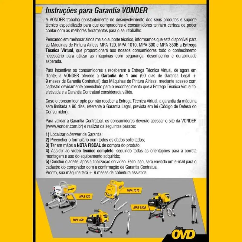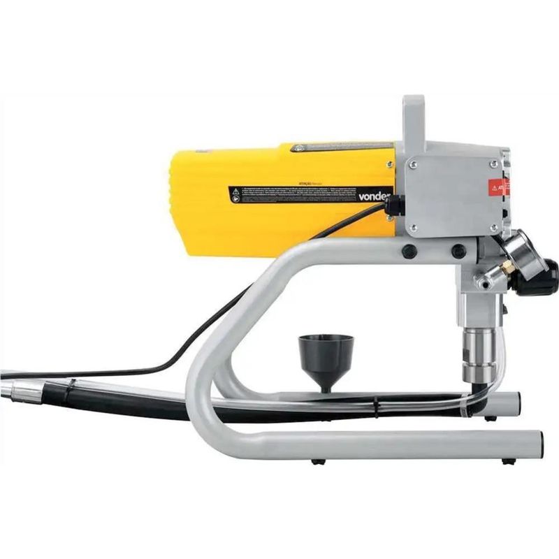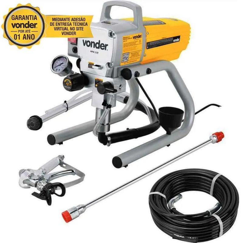 Máquina de Pintura Airless 1.2 HP MPA 120 VONDERÉ a escolha ideal para profissionais que buscam eficiência, praticidade e resultados de alta qualidade em seus projetos de pintura. Com um design robusto e fácil de manusear, este equipamento oferece alto desempenho para uma ampla gama de aplicações, desde pinturas em paredes e tetos até acabamentos finos em móveis e peças automotivas. A MPA 120 é uma máquina de pintura do tipo Airless, que permite a aplicação de tintas de forma rápida e uniforme, sem a necessidade de ar comprimido, garantindo menos desperdício e um acabamento impecável.Equipado com um motor de 1,2 HP (900 W), a MPA 120 proporciona uma pressão máxima de saída de 3.000 lbf/pol², o que assegura uma aplicação de tinta constante e de alta qualidade, sem oscilações na pressão. Isso significa mais agilidade e menor esforço no trabalho, aumentando a produtividade e o rendimento das tarefas. Sua vazão de 2,2 litros por minuto é ideal para atender à demanda de grandes áreas, como paredes, fachadas e outros espaços amplos, permitindo realizar a pintura de forma rápida e eficiente.Uma das grandes vantagens desta máquina é a presença de um pistão em aço inox e engrenagens com dentes helicoidais usinados, o que proporciona maior resistência ao desgaste, menos ruído durante a operação e um torque mais elevado, garantindo a durabilidade do equipamento e a precisão na aplicação da tinta. Além disso, a máquina vem com uma mangueira de 15 metros, proporcionando liberdade de movimento durante o trabalho e evitando a necessidade de deslocar constantemente o equipamento.VANTAGENS E BENEFÍCIOSAlta Performance e Eficiência: Com motor de 1,2 HP e vazão de 2,2 litros por minuto, é capaz de cobrir grandes áreas de forma rápida e eficiente, sem perder a qualidade do acabamento.Tecnologia Airless: A aplicação de tinta sem a necessidade de ar comprimido resulta em menor desperdício e acabamento mais uniforme, proporcionando um resultado profissional com menos esforço.Pistão em Aço Inox: A presença de um pistão de aço inox aumenta a durabilidade do equipamento e a resistência ao desgaste, garantindo uma longa vida útil, mesmo em uso contínuo.Engrenagens Usinadas: As engrenagens usinadas com dentes helicoidais garantem menor ruído, maior resistência e transmissão de torque eficiente, além de melhorar a performance geral da máquina.DADOS TÉCNICOSPotência do motor: 1,2 HP (900 W)Pressão máxima de saída: 3.000 lbf/pol²Vazão da pistola para pintura: 2,2 Litros/minBico padrão: 517Leque do bico: Abertura de 25 cm a 30 cmEspessura do bico: 0,43 mm (0,017")Rosca da conexão da mangueira: 1/4" NPSMComprimento da mangueira: 15 metrosComprimento do cordão elétrico: 2,50 metrosComprimento do tubo extensor: 457 mmMaterial do tubo extensor: AlumínioMassa aproximada: 15,5 kgTensão: 110V ou 220V (monofásico) *Escolha a voltagem no ato da compra.Frequência: 50 Hz / 60 HzCONTEÚDO1 Máquina de Pintura1 mangueira com 15 m1 pistola de pintura (bico 517 e filtro interno malha 60)1 tubo extensor para pinturaGarantia: 12 mesesReferência: 6220001220 Marca: VONDER * Atenção: Para o cliente estender a garantia deste equipamento para 12 meses é muito importante o cadastro preenchido para o reconhecimento da ENTREGA TÉCNICA VIRTUAL. * Imagens meramente ilustrativas