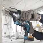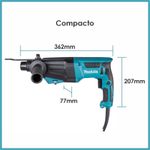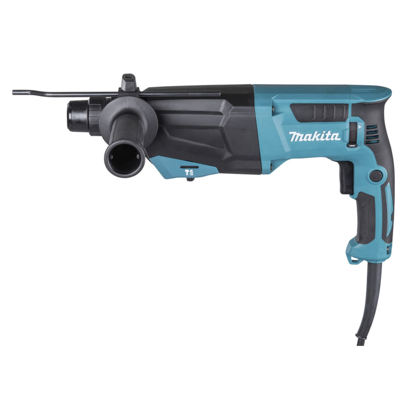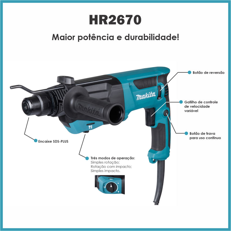 MARTELO COMBINADO PERFURADOR E ROMPEDOR MAKITA, MODELO HR2670, COM 800W DE POTÊNCIA E 3,0 JOULES Este é o novo martelete rompedor da Makita, o HR2670, com 800W e 3,0J. É ideal para trabalhos mais exigentes, com maior potência e durabilidade. O modelo HR2670 é compatível com brocas SDS PLUS. Devido ao redesenho da sua estrutura interna, a Makita conseguiu atribuir maior potência e durabilidade. Ele é equipado com três modos de operação: somente perfuração, perfuração com impacto e somente impacto. Diferenciais do HR2670 Maior potência e durabilidade; Energia de impacto de 3J; Maior eficiência em perfuração comparado ao modelo anterior; Botão de bloqueio embutido para uso contínuo; Dupla isolação; Velocidade variável e reversível; Capacidade: Diâmetro máximo de perfuração em concreto(com broca TCT): 26 mm; Diâmetro máximo de perfuração em concreto(com coroa): 68 mm; Diâmetro máximo de perfuração em concreto(com coroa diamantada): 80 mm; Faixa de diâmetro ideal de perfuração em concreto: 4 - 18 mm; Diâmetro máximo de perfuração em madeira: 32 milímetros; Diâmetro máximo de perfuração em aço: 13 milímetros; Dados técnicos: Potência de entrada contínua: 800 W; Velocidade sem carga: 0 - 1500 min; Impactos por Minuto (IPM): 0 - 4500 min; Energia de Impacto: 3,0 J; Adaptado para bits SDS-PLUS; Cabo de alimentação: 4,0 m; Nível de potência sonora: 102 dB(A); Nível de pressão sonora: 94 dB(A); Peso: 2,9 kg; Dimensões do produto (C x L x A): 362 x 77 x 207 mm; Potência máxima de saída: 550 W; Nível de vibração, perfuração com martelo em concreto: 16,1 m/s²; Incerteza de vibração (fator K), perfuração de martelo em concreto: 1,5 m/s²; Nível de vibração, cinzelamento: 14,2 m/s²; Incerteza de vibração (fator K), cinzelamento: 1,5 m/s² Itens que acompanham a máquina: -01 Empunhadura lateral; -01 Limitador de profundidade; -01 Maleta;
