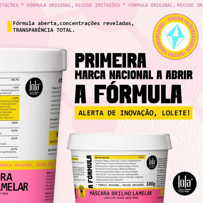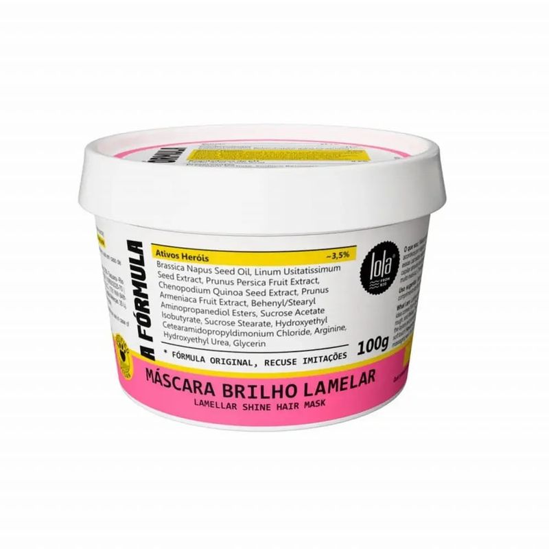 Máscara Capilar Lola A Fórmula 100g Brilho tridimensional e fios incrivelmente macios! A Máscara Capilar Lola A Fórmula foi desenvolvida para retexturizar e reorganizar a fibra capilar, devolvendo alinhamento, maciez e luminosidade aos cabelos opacos e sem vida. Ideal para quem busca um tratamento rápido e eficaz, com resultado visível desde a primeira aplicação. Para que serve a Máscara Capilar Lola A Fórmula? A Máscara Lola A Fórmula atua diretamente na estrutura dos fios, ajudando a alinhar as camadas da fibra capilar quando estão desorganizadas. Esse processo melhora a textura do cabelo, reduz o aspecto áspero e opaco e proporciona um brilho tridimensional intenso, além de um toque extremamente macio. Descrição do Produto Inspirada no conceito das lamelas, camadas fininhas que compõem o fio, a Máscara Lola A Fórmula 100g possui ativos especiais que reorganizam essas camadas, deixando a superfície do cabelo mais lisa e capaz de refletir muito mais luz. O resultado são fios mais alinhados, sedosos e com aparência saudável e revitalizada. Fica a Dica Para potencializar os resultados, adicione algumas gotinhas do seu óleo Lola favorito à máscara e deixe o tratamento ainda mais poderoso. Modo de Uso Após lavar os cabelos com o shampoo Lola de sua preferência, aplique a máscara A Fórmula por todo o comprimento dos fios, massageando bem. Deixe agir de 2 a 3 minutos e enxágue completamente. Principais Benefícios Retexturiza e reorganiza a fibra capilar; Alinha as camadas do fio; Brilho tridimensional intenso; Toque super macio e sedoso; Reduz o aspecto opaco e áspero; Tratamento rápido com ação eficaz; Ideal para cabelos sem vida e desalinhados.