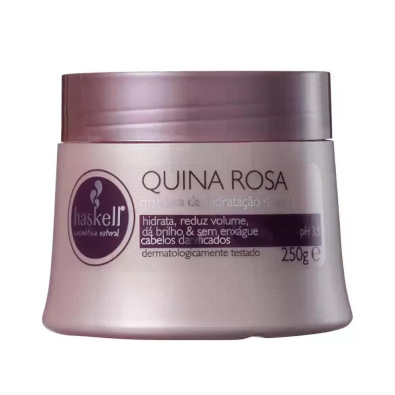Máscara para cabelos danificados. Másara Capilar Haskell Quina Rosa hidrata, reduz volume e restaura os fios para cabelo luminoso e saudável. Haskell Quina Rosa tem ação 4 em 1 e pode ser usada sem enxágue. Recupera os fios levemente danificados por processos mecânicos, como escovar e pentear o cabelo, ou pelo tempo. Forma um filme ao redor da fibra para proteger, dar brilho e controlar o volume além de devolver hidratação. Ação Extrato de Quina Rosa: protege e garante o condicionamento e a luminosidade. Como Usar Haskell Quina Rosa Depois de lavar o cabelo, retire o excesso de água e aplique a máscara mecha a mecha, do comprimento às pontas. Deixe agir por 15 minutos e enxágue completamente. Pode ser usada como leave-in, nos fios úmidos ou secos, e, nesse caso, dispensa o enxágue. Resultado O seu cabelo fica maleável, com brilho luminoso, protegido e com o volume controlado.