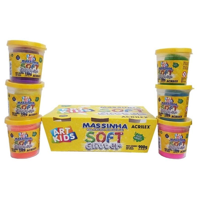 Nova Massinha de Modelar Soft Glitter Caixa com 6 Cores Variadas Acrilex 07366. A base de amido, super macia e com cores vivas e brilhantes. Para uso escolar ou entretenimento. Ideal para atividades de desenvolvimento da coordenação motora e percepção de formas. Não gruda nas mãos. Não tóxico. Especificações • Marca: Acrilex • Referência: 07366 • Cor: Colorido • Composição: Água, Carboidrato de Cereales, Gluten, Cloreto de Sódio, Conservante, Fragrância, Aditivos y Pigmentos . • Não indicado para criança menores de 3 anos. • Garantia do Fornecedor: 03 meses contra defeitos de fabricação Itens Inclusos • 150g de Massinha Rosa • 150g de Massinha Roxa • 150g de Massinha Laranja • 150g de Massinha Amarela • 150g de Massinha Azul • 150g de Massinha Verde Peso e Dimensões Aproximadas do produto na caixa: • Largura: 17 cm. Altura: 9cm. Comprimento: 26cm. • Peso: 1260g. As cores podem variar entre as imagens mostradas acima e o produto. Imagens meramente ilustrativas. Produto Certificado- Registro Inmetro: 004 875/2021 OCP 0098 Validade: Indeterminada.