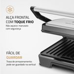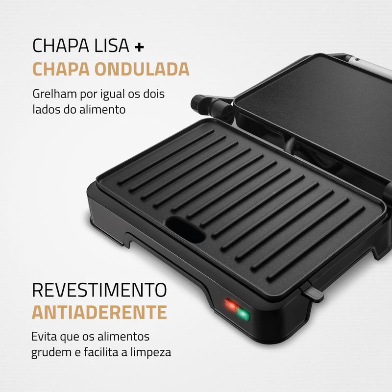 Perfeito para uma rotina com mais sabor e praticidade! O Master Press Duo PG-01-180 possui abertura 180° que garante mais praticidade ao usar as duas chapas ao mesmo tempo. Ele é 3 em 1: funciona como grill, chapa e sanduicheira. Possui revestimento antiaderente e grelhas duplas, que grelham por igual os dois lados do alimento sem grudar. Saiba mais sobre o PG-01-180 da Mondial: ABERTURA 180°: O Master Press Duo da Mondial pode usar aberto ou fechado. A abertura 180° garante mais praticidade ao usar as duas chapas ao mesmo tempo. Além disso, grelha o dobro de alimentos de uma só vez. 3 EM 1: Versátil, o produto funciona como sanduicheira, grill e chapa. CHAPA LISA + CHAPA ONDULADA: Aquece dos dois lados e grelham os alimentos por igual. Os dois tipos de chapas te permite preparar variadas receitas. CHAPAS AJUSTÁVEIS: Garante mais facilidade no preparo de alimentos com espessuras variadas. REVESTIMENTO ANTIADERENTE: As chapas antiaderentes aquecem rapidamente, evitam que os alimentos grudem e são mais fáceis de limpar. VERSATILIDADE DE RECEITAS: Você pode preparar grelhados, sanduíches, espetinhos, vegetais, panquecas, ovos e muito mais. ALÇA FRONTAL ISOTÉRMICA: A alça não aquece e permite o manuseio do aparelho com segurança. FÁCIL DE GUARDAR: Possui trava de armazenamento e pode ser guardado na vertical. BANDEJA COLETORA: Um sistema para facilitar a limpeza do seu grill. A gordura em excesso dos alimentos cai no recipiente e pode ser descartada com facilidade. LÂMPADA PILOTO: Indica o funcionamento do produto. UM ANO DE GARANTIA MONDIAL: A Mondial é a escolha de milhões de consumidores. Mondial, a escolha inteligente!