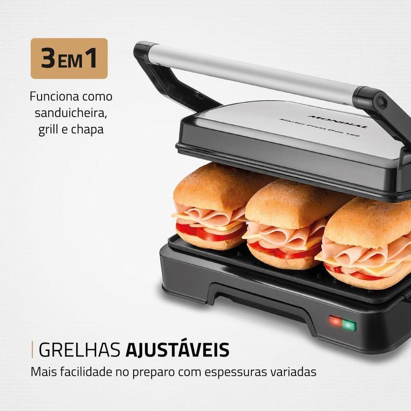 Perfeito para uma rotina com mais sabor e praticidade! O Master Press Duo PG-01-180 possui abertura 180° que garante mais praticidade ao usar as duas chapas ao mesmo tempo. Ele é 3 em 1: funciona como grill, chapa e sanduicheira. Possui revestimento antiaderente e grelhas duplas, que grelham por igual os dois lados do alimento sem grudar. Saiba mais sobre o PG-01-180 da Mondial:ABERTURA 180°: O Master Press Duo da Mondial pode usar aberto ou fechado. A abertura 180° garante mais praticidade ao usar as duas chapas ao mesmo tempo. Além disso, grelha o dobro de alimentos de uma só vez.3 EM 1: Versátil, o produto funciona como sanduicheira, grill e chapa.CHAPA LISA + CHAPA ONDULADA: Aquece dos dois lados e grelham os alimentos por igual. Os dois tipos de chapas te permite preparar variadas receitas.CHAPAS AJUSTÁVEIS: Garante mais facilidade no preparo de alimentos com espessuras variadas.REVESTIMENTO ANTIADERENTE: As chapas antiaderentes aquecem rapidamente, evitam que os alimentos grudem e são mais fáceis de limpar.VERSATILIDADE DE RECEITAS: Você pode preparar grelhados, sanduíches, espetinhos, vegetais, panquecas, ovos e muito mais.ALÇA FRONTAL ISOTÉRMICA: A alça não aquece e permite o manuseio do aparelho com segurança.FÁCIL DE GUARDAR: Possui trava de armazenamento e pode ser guardado na vertical.BANDEJA COLETORA: Um sistema para facilitar a limpeza do seu grill. A gordura em excesso dos alimentos cai no recipiente e pode ser descartada com facilidade.LÂMPADA PILOTO: Indica o funcionamento do produto.UM ANO DE GARANTIA MONDIAL: A Mondial é a escolha de milhões de consumidores. Mondial, a escolha inteligente!Modelo - PG-01-180Cor - Preto/InoxVoltagem (Tensão) - 127V/220VItens inclusos - 01 Press Grill; Manual de Instruções.Comprimento do cabo - 0,70MLuz indicadora - SimBandeja coletora - SimControle de temperatura - NãoTipo de preparo - funciona como grill, chapa e sanduicheiraTipo de tomada - 10ATipo de Chapa - AntiaderenteGuarda fio - SimAntiaderente - SimAlimentação - Energia ElétricaMaterial - PP e InoxPotência - 1000WPeso - 1,17kgGarantia - 1 AnoMarca - Mondial