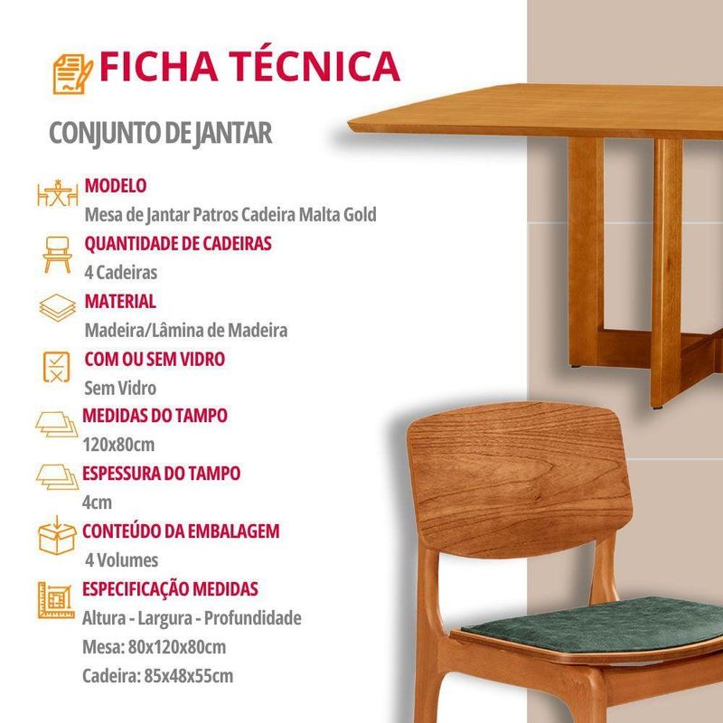 Mesa 120 Laminado Com 4 Cadeiras Malta Gold Moderna Mobília Jade Imbuia NaturaleO conjunto de mesa de jantar Patros com 4 cadeiras Malta Gold combina sofisticacao, qualidade e design contemporaneo.A mesa Patros se destaca pelo tampo em madeira laminada, com formato barril, que traz um toque unico e elegante ao ambiente. Sua base de linhas harmoniosas acrescenta um estilo moderno, enquanto a madeira de alta qualidade e o acabamento refinado garantem durabilidade e um visual sofisticado.As cadeiras Malta Gold, feitas em madeira macica, unem resistencia e um design minimalista. O assento estofado proporciona conforto, e o encosto de madeira adiciona um charme rustico e elegante. Juntos, a mesa e as cadeiras criam um espaco acolhedor e estiloso, perfeito para quem busca um ambiente de qualidade, bom gosto e conforto.Caracteristicas:Tampo Formato BarrilBase da Mesa entregue montadaCadeiras sao entregues montadasMaterial da Estrutura: MadeiraPossui Vidro: NaoDimensoes da Mesa:Altura: 80 cmLargura: 120 cmProfundidade: 80 cmDimensoes das Cadeiras:Altura: 85 cmLargura: 48 cmProfundidade: 55 cmQuantidade: 4 CadeirasGarantia: 03 MesesObservacoes:Os objetos que ambientam as fotos nao acompanham o produto.Nao disponibilizamos a montagem do produto.O produto acompanha manual de montagem. Nao nos responsabilizamos por danos no produto causados por montagem de qualquer outra forma que nao seja a descrita no manual.Verifique as dimensoes do produto e certifique-se que o percurso que ele fara ate o local de uso permite sua passagem.A Moderna Mobilia reserva o direito de alterar as especificacoes tecnicas sem previo aviso.As medidas contidas no site podem sofrer variacoes de acordo com a montagem, tipo de costura etc.A montagem sera de responsabilidade do comprador.Nao nos responsabilizamos, no ato da entrega, por subir escadas-elevadores em apartamentos.Eventuais despesas sao de responsabilidade do comprador.As tonalidades das cores podem sofrer alteracao de acordo com a configuracao de cada monitor.