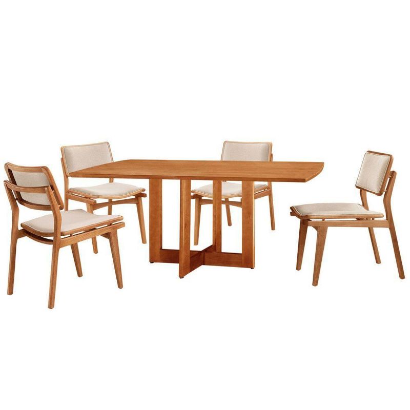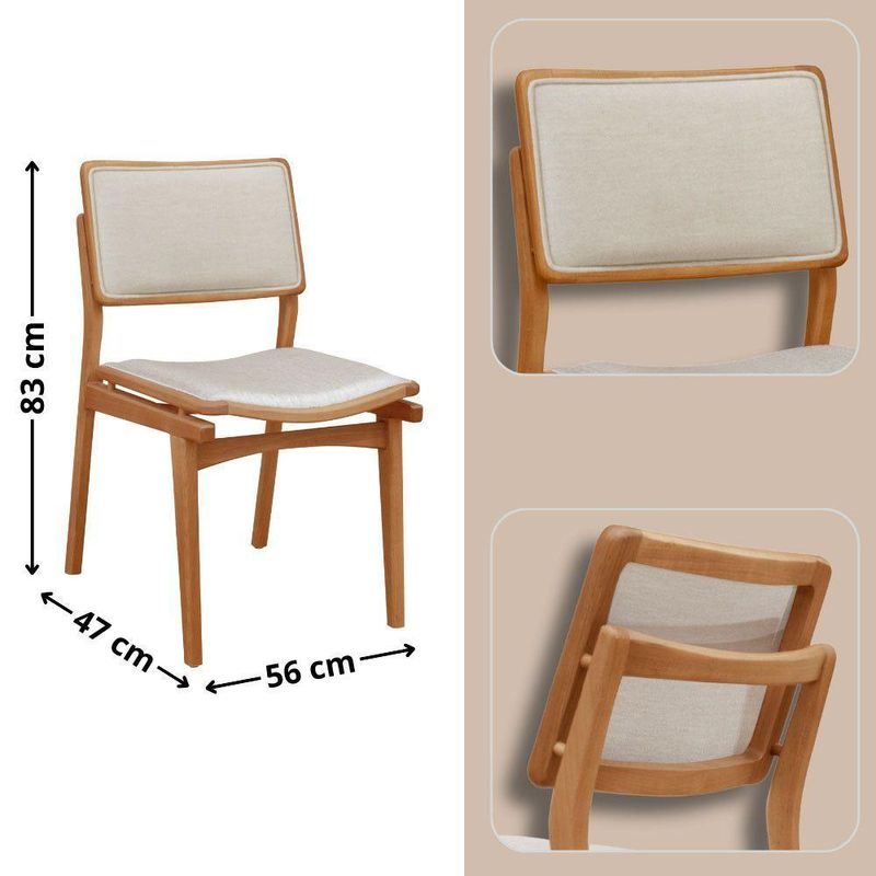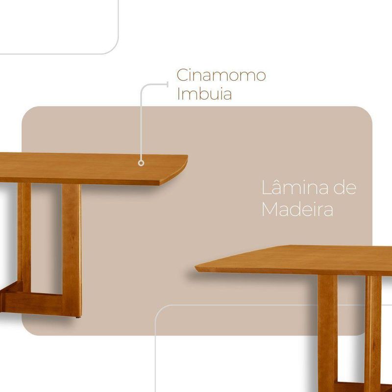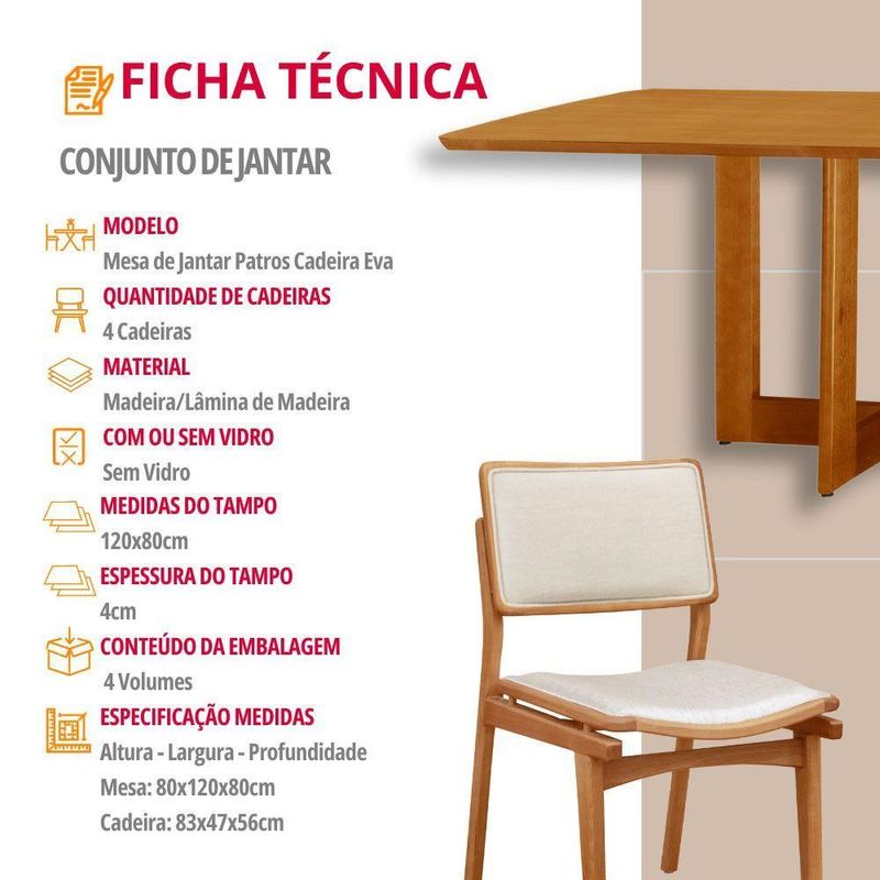Mesa 120cm Laminado Barril Com 4 Cadeiras Moderna Mobília Linho Off White Imbuia NaturaleA mesa Patros se destaca pelo tampo em madeira laminada, com formato barril, que traz um toque unico e elegante ao ambiente. Sua base de linhas harmoniosas acrescenta um estilo moderno, enquanto a madeira de alta qualidade e o acabamento refinado garantem durabilidade e um visual sofisticado.As cadeiras Eva complementam perfeitamente esse conjunto, trazendo um toque ainda mais natural e aconchegante. Feitas em madeira macica e cuidadosamente estofadas no assento e encosto, oferecem o equilibrio ideal entre conforto e design. Seu formato envolvente acolhe de forma unica, criando o ambiente perfeito para momentos inesqueciveis ao redor da mesa.Juntos, a mesa Patros e as cadeiras Eva transformam sua sala de jantar em um refugio de beleza, sofisticacao e exclusividade, onde o encanto da natureza se encontra com um design premium.Caracteristicas:Tampo Formato BarrilBase da Mesa entregue montadaCadeiras sao entregues montadasQuantidade de Cadeiras: 04 CadeirasMaterial da Estrutura: MadeiraPossui Vidro: NaoDimensoes da Mesa:Altura: 80 cmLargura: 120 cmProfundidade: 80 cmDimensoes das Cadeiras:Altura: 83 cmLargura: 56 cmProfundidade: 47 cmGarantia: 03 MesesObservacoes:Os objetos que ambientam as fotos nao acompanham o produto.Nao disponibilizamos a montagem do produto.O produto acompanha manual de montagem. Nao nos responsabilizamos por danos no produto causados por montagem de qualquer outra forma que nao seja a descrita no manual.Verifique as dimensoes do produto e certifique-se que o percurso que ele fara ate o local de uso permite sua passagem.A Moderna Mobilia reserva o direito de alterar as especificacoes tecnicas sem previo aviso.As medidas contidas no site podem sofrer variacoes de acordo com a montagem, tipo de costura etc.A montagem sera de responsabilidade do comprador.Nao nos responsabilizamos, no ato da entrega, por subir escadas-elevadores em apartamentos.Eventuais despesas sao de responsabilidade do comprador.As tonalidades das cores podem sofrer alteracao de acordo com a configuracao de cada monitor.
