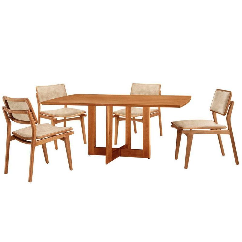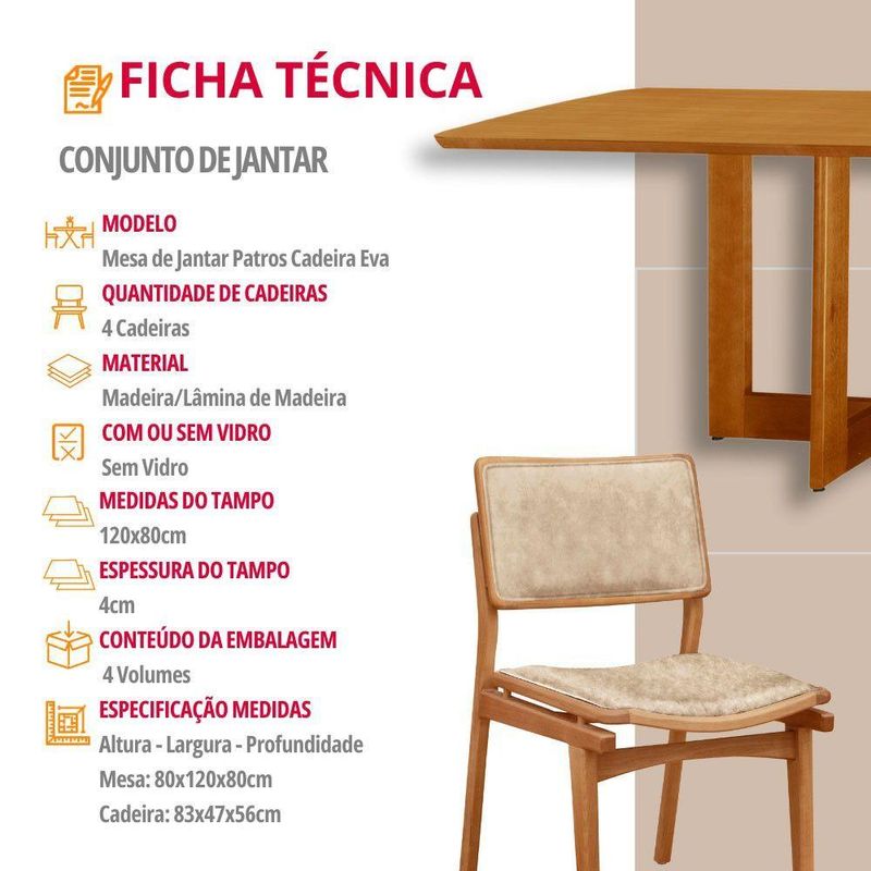 Mesa 120cm Laminado Barril Com 4 Cadeiras Moderna Mobília Milano Imbuia NaturaleA mesa Patros se destaca pelo tampo em madeira laminada, com formato barril, que traz um toque unico e elegante ao ambiente. Sua base de linhas harmoniosas acrescenta um estilo moderno, enquanto a madeira de alta qualidade e o acabamento refinado garantem durabilidade e um visual sofisticado.As cadeiras Eva complementam perfeitamente esse conjunto, trazendo um toque ainda mais natural e aconchegante. Feitas em madeira macica e cuidadosamente estofadas no assento e encosto, oferecem o equilibrio ideal entre conforto e design. Seu formato envolvente acolhe de forma unica, criando o ambiente perfeito para momentos inesqueciveis ao redor da mesa.Juntos, a mesa Patros e as cadeiras Eva transformam sua sala de jantar em um refugio de beleza, sofisticacao e exclusividade, onde o encanto da natureza se encontra com um design premium.Caracteristicas:Tampo Formato BarrilBase da Mesa entregue montadaCadeiras sao entregues montadasQuantidade de Cadeiras: 04 CadeirasMaterial da Estrutura: MadeiraPossui Vidro: NaoDimensoes da Mesa:Altura: 80 cmLargura: 120 cmProfundidade: 80 cmDimensoes das Cadeiras:Altura: 83 cmLargura: 56 cmProfundidade: 47 cmGarantia: 03 MesesObservacoes:Os objetos que ambientam as fotos nao acompanham o produto.Nao disponibilizamos a montagem do produto.O produto acompanha manual de montagem. Nao nos responsabilizamos por danos no produto causados por montagem de qualquer outra forma que nao seja a descrita no manual.Verifique as dimensoes do produto e certifique-se que o percurso que ele fara ate o local de uso permite sua passagem.A Moderna Mobilia reserva o direito de alterar as especificacoes tecnicas sem previo aviso.As medidas contidas no site podem sofrer variacoes de acordo com a montagem, tipo de costura etc.A montagem sera de responsabilidade do comprador.Nao nos responsabilizamos, no ato da entrega, por subir escadas-elevadores em apartamentos.Eventuais despesas sao de responsabilidade do comprador.As tonalidades das cores podem sofrer alteracao de acordo com a configuracao de cada monitor.