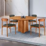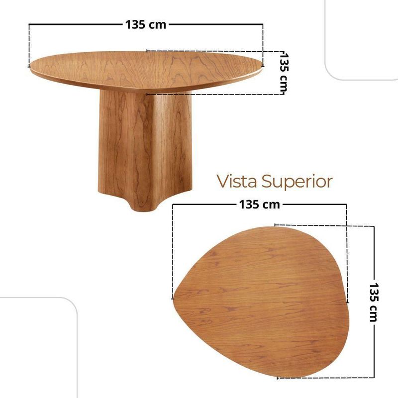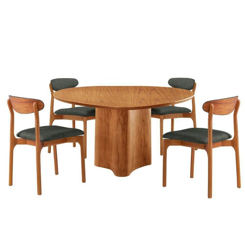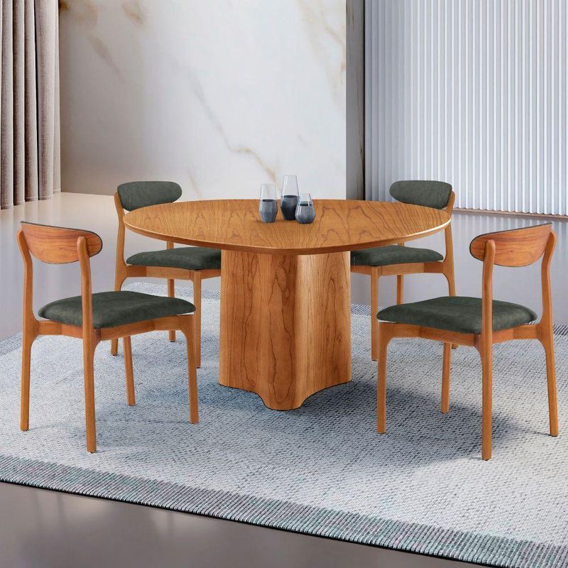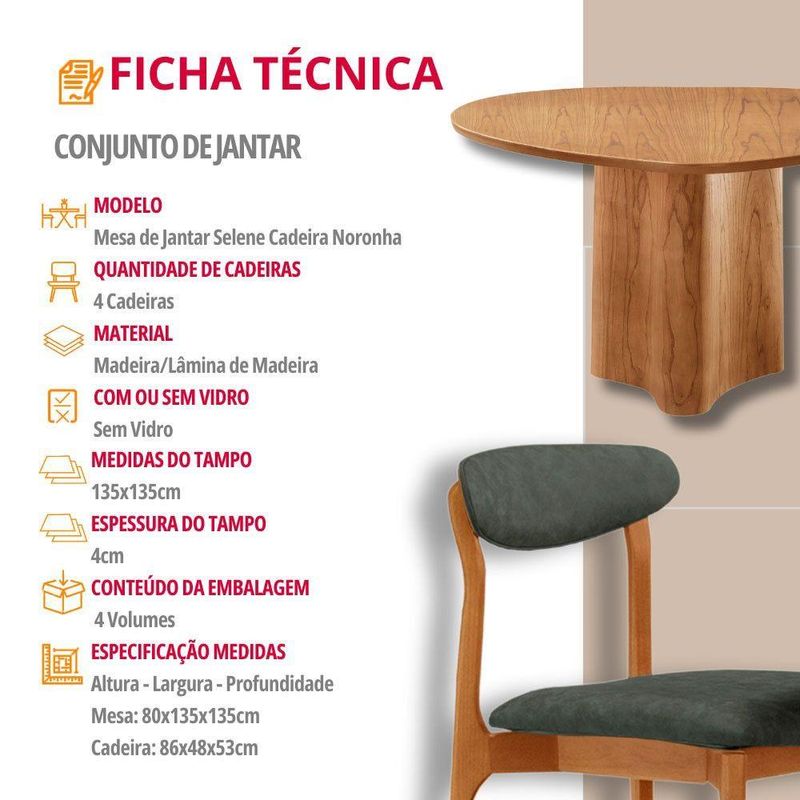 Mesa 135cm Laminado Com 4 Cadeiras Noronha Moderna Jade Imbuia NaturaleA mesa Selene, inspirada na beleza serena da natureza, possui um design organico e atemporal que transforma qualquer ambiente em um refugio de aconchego e estilo. Suas linhas suaves evocam a fluidez da natureza, enquanto sua estrutura solida transmite a forca e durabilidade dos troncos centenarios, criando um espaco perfeito para momentos inesqueciveis com amigos e familiares.As 4 cadeiras Noronha complementam o conjunto com uma expressao sublime de modernidade. Construidas em madeira macica, essas cadeiras exibem detalhes curvos que conferem uma estetica contemporanea e elegante. O assento e encosto estofados oferecem um conforto luxuoso, perfeito para momentos prolongados de convivencia ao redor da mesa. Os detalhes de madeira na parte de tras dos encostos adicionam um toque de charme rustico e autenticidade, criando um contraste harmonioso com o design moderno e sofisticado das cadeiras.Caracteristicas:Tampo OrganicoMesa com base pre-montadaCadeiras sao entregues montadasQuantidade de Cadeiras: 04Material da Estrutura: MadeiraPossui Vidro: NaoDimensoes da Mesa:Altura: 80 cmLargura: 135 cmProfundidade: 135 cmDimensoes das Cadeiras:Altura: 86 cmLargura: 48 cmProfundidade: 53 cmGarantia: 03 MesesObservacoes:Os objetos que ambientam as fotos nao acompanham o produto.Nao disponibilizamos a montagem do produto.O produto acompanha manual de montagem. Nao nos responsabilizamos por danos no produto causados por montagem de qualquer outra forma que nao seja a descrita no manual.Verifique as dimensoes do produto e certifique-se que o percurso que ele fara ate o local de uso permite sua passagem.A Moderna Mobilia reserva o direito de alterar as especificacoes tecnicas sem previo aviso.As medidas contidas no site podem sofrer variacoes de acordo com a montagem, tipo de costura etc.A montagem sera de responsabilidade do comprador.Nao nos responsabilizamos, no ato da entrega, por subir escadas/elevadores em apartamentos.Eventuais despesas sao de responsabilidade do comprador.As tonalidades das cores podem sofrer alteracao de acordo com a configuracao de cada monitor.