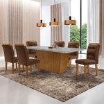 Mesa Aida 180cm Com 6 Cadeiras Carol Moderna Mobília Veludo Marrom/off White/imbuiaMesa para Sala de Jantar Aida 180cm MDF Canto Copo com Vidro e 6 Cadeiras CarolA Sala de Jantar Aida, combinada com as elegantes Cadeiras Carol, e a escolha ideal para quem busca um espaco aconchegante e classico. O conjunto, produzido em MDF, destaca-se pela robustez e pelas linhas retas da base, que trazem um toque de charme contemporaneo. O tampo curvo em vidro nao so embeleza, mas tambem garante mais seguranca, especialmente em lares com criancas. As Cadeiras Carol, com assento e encostos estofados, apresentam detalhes com botoes no encosto, elevando o design e o conforto. Juntas, essas pecas criam um ambiente perfeito para momentos inesqueciveis a mesaCaracteristicas:Marca: Moderna MobiliaMesa e CadeirasTampo Canto CopoTipo de Acabamento: Pintura UVMaterial da Estrutura: 100 MDFPossui Vidro: SimDimensoes da Mesa:Altura: 80cmLargura: 180cmProfundidade: 90cmDimensoes das Cadeiras:Altura: 102,5cmLargura: 42cmProfundidade: 56cmGarantia do Fornecedor: 3 mesesInformacoes Importantes:As tonalidades das cores podem sofrer alteracao de acordo com a configuracao de cada monitor.Os objetos que ambientam as fotos nao acompanham o produto.Nao disponibilizamos a montagem do produto.Nao nos responsabilizamos por danos no produto causado por montagem.Verifique as dimensoes do produto e certifique-se que o percurso que ele fara ate o local de uso permite sua passagem.Para mais informacoes confira as politicas de entrega do site.Favor verificar o produto no ato da entrega e em caso de problemas decorrentes no transporte (arranhados, quebra, batida, amassados) deve-se efetuar a ressalva na nota fiscal para conhecimento da transportadora e comunicar imediatamente a loja.Moderna Mobilia reserva o direito de alterar as especificacoes tecnicas sem previo aviso.As medidas contidas no site podem sofrer variacoes de acordo com a montagem, tipo de costura etc.
