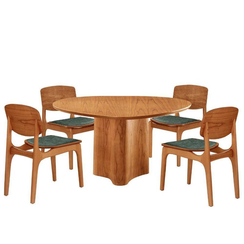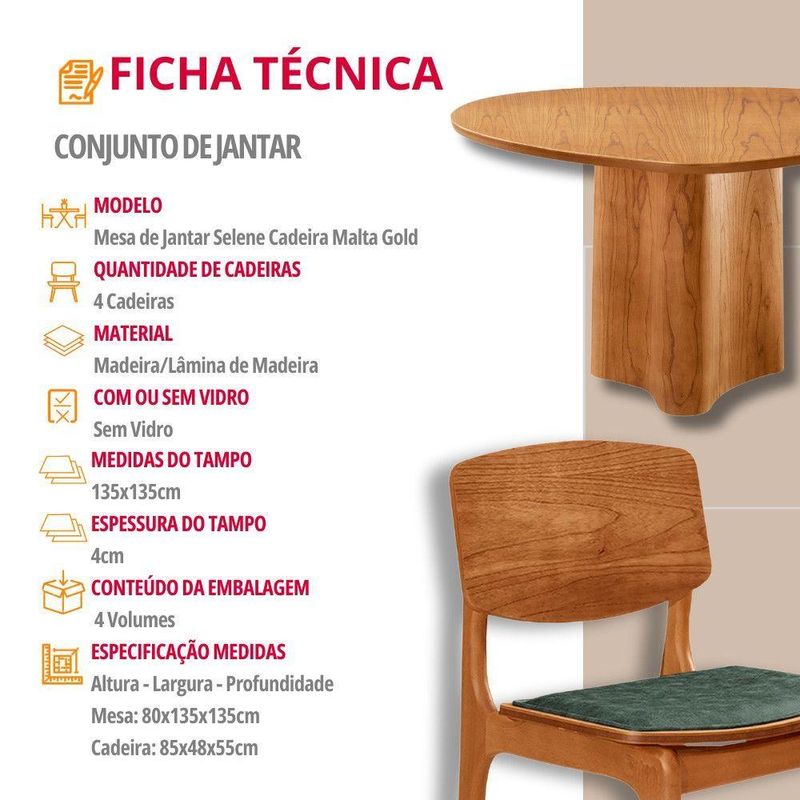 Mesa Com 4 Cadeiras Selene Malta Gold Moderna Mobília Jade / Imbuia Nat.O conjunto de mesa de jantar Selene com 4 cadeiras Malta Gold e a combinacao perfeita de design organico e modernidade. A mesa Selene, inspirada na beleza serena da natureza, traz um design atemporal e suave, que transforma qualquer ambiente em um refugio acolhedor e elegante. Suas linhas fluidas evocam a tranquilidade da natureza, enquanto sua estrutura solida transmite a forca e durabilidade dos troncos centenarios, criando o ambiente ideal para momentos especiais com amigos e familiares.As 4 cadeiras Malta Gold complementam a mesa de maneira impecavel. Construidas em madeira macica, elas oferecem resistencia e durabilidade, alem de um design minimalista e moderno que se destaca em qualquer ambiente. O assento estofado proporciona conforto extra, enquanto o encosto em madeira macica adiciona um charme rustico e natural ao conjunto, equilibrando perfeitamente funcionalidade e estilo. Juntos, a mesa Selene e as cadeiras Malta Gold criam um espaco sofisticado, elegante e acolhedor, ideal para quem busca um ambiente contemporaneo com um toque de qualidade e durabilidade. Caracteristicas: Tampo Organico Mesa com base pre-montada Cadeiras sao entregues montadas Material da Estrutura: Madeira Possui Vidro: Nao Quantidade de Cadeiras: 4 Cadeiras Dimensoes da Mesa: Altura: 80 cm Largura: 135 cm Profundidade: 135 cm Dimensoes das Cadeiras: Altura: 85 cm Largura: 48 cm Profundidade: 55 cm Garantia do Fabricante: 03 Meses Observacoes: Os objetos que ambientam as fotos nao acompanham o produto. Nao disponibilizamos a montagem do produto. O produto acompanha manual de montagem. Nao nos responsabilizamos por danos no produto causados por montagem de qualquer outra forma que nao seja a descrita no manual. Verifique as dimensoes do produto e certifique-se que o percurso que ele fara ate o local de uso permite sua passagem. A Moderna Mobilia reserva o direito de alterar as especificacoes tecnicas sem previo aviso. As medidas contidas no site podem sofrer variacoes de acordo com a montagem, tipo de costura etc. A montagem sera de responsabilidade do comprador. Nao nos responsabilizamos, no ato da entrega, por subir escadas/elevadores em apartamentos. Eventuais despesas sao de responsabilidade do comprador. As tonalidades das cores podem sofrer alteracao de acordo com a configuracao de cada monitor.
