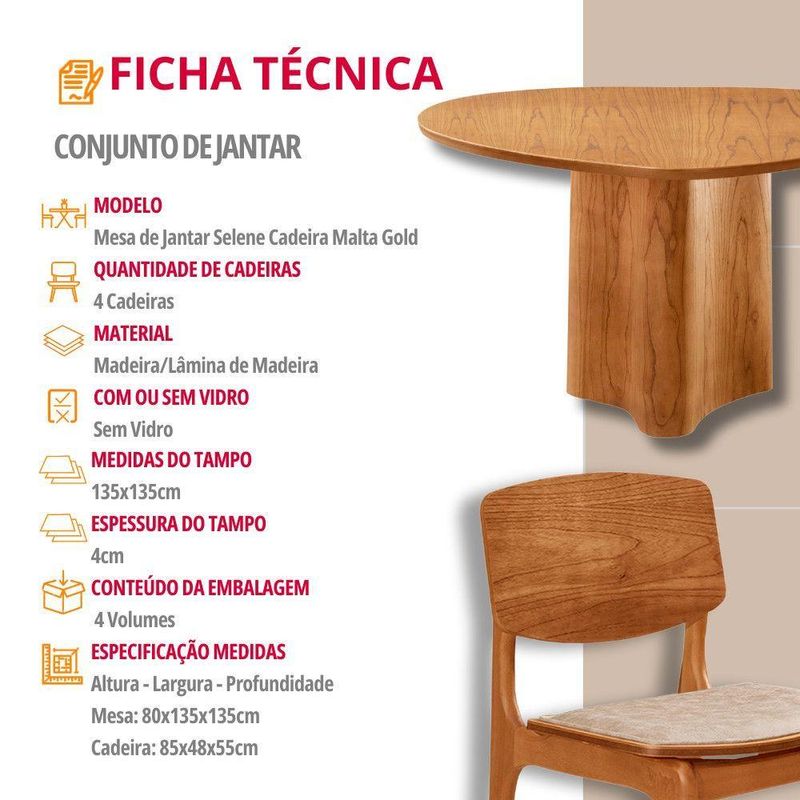 Mesa Com 4 Cadeiras Selene Malta Gold Moderna Mobília Milano / Imbuia Nat.O conjunto de mesa de jantar Selene com 4 cadeiras Malta Gold e a combinacao perfeita de design organico e modernidade. A mesa Selene, inspirada na beleza serena da natureza, traz um design atemporal e suave, que transforma qualquer ambiente em um refugio acolhedor e elegante. Suas linhas fluidas evocam a tranquilidade da natureza, enquanto sua estrutura solida transmite a forca e durabilidade dos troncos centenarios, criando o ambiente ideal para momentos especiais com amigos e familiares.As 4 cadeiras Malta Gold complementam a mesa de maneira impecavel. Construidas em madeira macica, elas oferecem resistencia e durabilidade, alem de um design minimalista e moderno que se destaca em qualquer ambiente. O assento estofado proporciona conforto extra, enquanto o encosto em madeira macica adiciona um charme rustico e natural ao conjunto, equilibrando perfeitamente funcionalidade e estilo. Juntos, a mesa Selene e as cadeiras Malta Gold criam um espaco sofisticado, elegante e acolhedor, ideal para quem busca um ambiente contemporaneo com um toque de qualidade e durabilidade. Caracteristicas: Tampo Organico Mesa com base pre-montada Cadeiras sao entregues montadas Material da Estrutura: Madeira Possui Vidro: Nao Quantidade de Cadeiras: 4 Cadeiras Dimensoes da Mesa: Altura: 80 cm Largura: 135 cm Profundidade: 135 cm Dimensoes das Cadeiras: Altura: 85 cm Largura: 48 cm Profundidade: 55 cm Garantia do Fabricante: 03 Meses Observacoes: Os objetos que ambientam as fotos nao acompanham o produto. Nao disponibilizamos a montagem do produto. O produto acompanha manual de montagem. Nao nos responsabilizamos por danos no produto causados por montagem de qualquer outra forma que nao seja a descrita no manual. Verifique as dimensoes do produto e certifique-se que o percurso que ele fara ate o local de uso permite sua passagem. A Moderna Mobilia reserva o direito de alterar as especificacoes tecnicas sem previo aviso. As medidas contidas no site podem sofrer variacoes de acordo com a montagem, tipo de costura etc. A montagem sera de responsabilidade do comprador. Nao nos responsabilizamos, no ato da entrega, por subir escadas/elevadores em apartamentos. Eventuais despesas sao de responsabilidade do comprador. As tonalidades das cores podem sofrer alteracao de acordo com a configuracao de cada monitor.