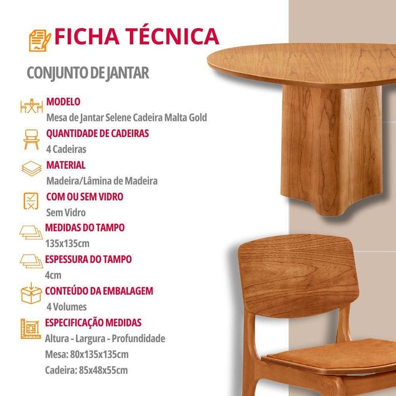 Mesa Com 4 Cadeiras Selene Malta Gold Moderna Mobília Star Caramelo / Imbuia Nat.O conjunto de mesa de jantar Selene com 4 cadeiras Malta Gold e a combinacao perfeita de design organico e modernidade. A mesa Selene, inspirada na beleza serena da natureza, traz um design atemporal e suave, que transforma qualquer ambiente em um refugio acolhedor e elegante. Suas linhas fluidas evocam a tranquilidade da natureza, enquanto sua estrutura solida transmite a forca e durabilidade dos troncos centenarios, criando o ambiente ideal para momentos especiais com amigos e familiares.As 4 cadeiras Malta Gold complementam a mesa de maneira impecavel. Construidas em madeira macica, elas oferecem resistencia e durabilidade, alem de um design minimalista e moderno que se destaca em qualquer ambiente. O assento estofado proporciona conforto extra, enquanto o encosto em madeira macica adiciona um charme rustico e natural ao conjunto, equilibrando perfeitamente funcionalidade e estilo. Juntos, a mesa Selene e as cadeiras Malta Gold criam um espaco sofisticado, elegante e acolhedor, ideal para quem busca um ambiente contemporaneo com um toque de qualidade e durabilidade. Caracteristicas: Tampo Organico Mesa com base pre-montada Cadeiras sao entregues montadas Material da Estrutura: Madeira Possui Vidro: Nao Quantidade de Cadeiras: 4 Cadeiras Dimensoes da Mesa: Altura: 80 cm Largura: 135 cm Profundidade: 135 cm Dimensoes das Cadeiras: Altura: 85 cm Largura: 48 cm Profundidade: 55 cm Garantia do Fabricante: 03 Meses Observacoes: Os objetos que ambientam as fotos nao acompanham o produto. Nao disponibilizamos a montagem do produto. O produto acompanha manual de montagem. Nao nos responsabilizamos por danos no produto causados por montagem de qualquer outra forma que nao seja a descrita no manual. Verifique as dimensoes do produto e certifique-se que o percurso que ele fara ate o local de uso permite sua passagem. A Moderna Mobilia reserva o direito de alterar as especificacoes tecnicas sem previo aviso. As medidas contidas no site podem sofrer variacoes de acordo com a montagem, tipo de costura etc. A montagem sera de responsabilidade do comprador. Nao nos responsabilizamos, no ato da entrega, por subir escadas/elevadores em apartamentos. Eventuais despesas sao de responsabilidade do comprador. As tonalidades das cores podem sofrer alteracao de acordo com a configuracao de cada monitor.