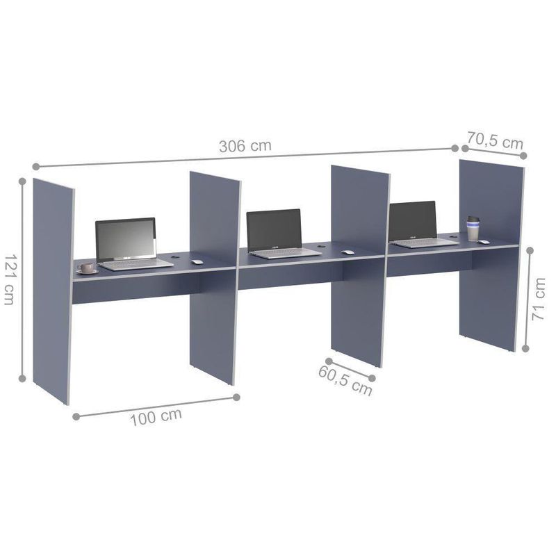 Mesa De Atendimento 3 Lugar Iron AzulO Balcão é essencial para você que deseja trazer mais conforto para seu cliente ao atende-lo.Em MDP BP ou EUCAPRINT 15 mmTampo com Passa fiosAcabamento de bordas em ABS.Dimensões do produto:Altura: 121 cmLargura: 306 cmProfundidade: 70 cmInformações do produto:Gaveta: Não.Porta: Não.Passa-Fio: Sim.Cor: AzulMaterial principal: MDP BP 15 MMQuantidade de lugares: 3.Itens incls:01 Call Center de Atendimento.Kit completo para montagem, manual de instruções para montagem.Garantia:3 meses contra defeito de fabricação.Informações complementares:- Fotos meramente ilustrativas do produto no ambiente.- Os objetos que ambientam as fotos não acompanham o produto;- Verificar descrição e tamanho do produto antes da compra.- Avaliar a mercadoria no ato do recebimento e recutilizar em caso de divergência ou s.- Mantenha as informações de contato e endereço de atualizados para entrarmos em contato caso necessário.- Limpar com flanela ou pano macio seco, não utilizar produtos abrasivos, desengordurantes, álcool ou solvente. Não expor o produto diretamente à luz solar e à umidade.* Sugerimos a contratação de um montador para a montagem do produto. Não nos responsabilizamos por s causadas no ato da montagem.* Não nos responsabilizamos pela montagem e desmontagem do produto no ato da e devolução, assim como os custos gerados nestas situações.* A rá o produto no andar térreo do endereço de .* Não nos responsabilizamos por subir escadas, corredores e elevadores ou por guincho em apartamentos. Instruções/Cuidados: Limpar com pano macio e seco, não utilizar produtos abrasivos. | Altura do Produto com Embalagem (cm): 25 | ALTURA DO PRODUTO COM EMBALAGEM (CM): 25 | COMPRIMENTO PRODUTO COM EMBALAGEM (CM): 126 | Peso do Produto (Kg): 70,4 | Estado de Origem: SP | CORES DO PRODUTO (FILTRO DE CORES): Azul | COR PREDOMINANTE: Azul | QUANTIDADE DE GAVETAS: Não | MATERIAL PARA FILTRO: MDP | Descrição do Tamanho: 121x306x70 cm | PESO PRODUTO COM EMBALAGEM (KG): 71,2 | MATERIAL PRINCIPAL: MDP | Cor Predominante: Azul | Conteúdo da Embalagem: 1 Balcão | Produto precisa de Montagem?: Sim, a montagem é simples mas sugerimos a contratação do serviço de montagem (para os CEPs em que o serviço está disponível) ou de algum experiente de sua preferência | Comprimento do Produto (cm): 70 | Cores do Produto (FILTRO DE CORES): Azul | Comprimento Produto Com Embalagem (cm): 126 | Material para Filtro: MDP | Altura do produto (cm): 121 | Material Principal: MDP | ALTURA: Acima de 100 cm | Largura Produto Com Embalagem (cm): 71 | Largura do Produto (cm): 306 | LARGURA PRODUTO COM EMBALAGEM (CM): 71 | Peso Produto Com Embalagem (Kg): 71,2 | COMPRIMENTO: De 70 cm a 85 cm | PESO DO PRODUTO (KG): 71,2 | LARGURA: Acima de 130 cm