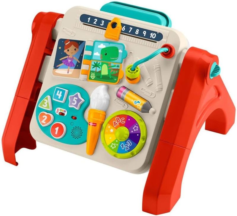 -Quatro maneiras para os bebês brincarem, aprenderem e criarem com este brinquedo eletrônico de aprendizagem que se transforma de um quadro de atividades em uma mesa de jogos e cavalete de arte. 3 níveis de aprendizagem Smart Stages com mais de 135 músicas, sons e frases que apresentam cores, números, contagem e causa e efeito. -Pressione os botões de tinta ou a roda de cores giratória para obter luzes, música e sons, além de atividades divertidas como uma barra de contas, um rolo de lápis, um controle deslizante de números e um flip book. -Cavalete de arte de verdade! Inclui um clipe para prender papel e guardar materiais. Este brinquedo ajuda a estimular as habilidades motoras, a expressão criativa, a brincadeira de faz de conta, a independência e muito mais para bebês e crianças de 6 meses a 3 anos. Características: Marca - Mattel Cód. JGW86 Medidas: 53,01 x 49 x 56,01 cm