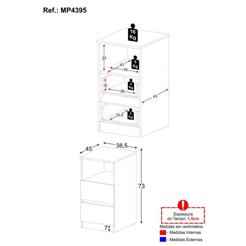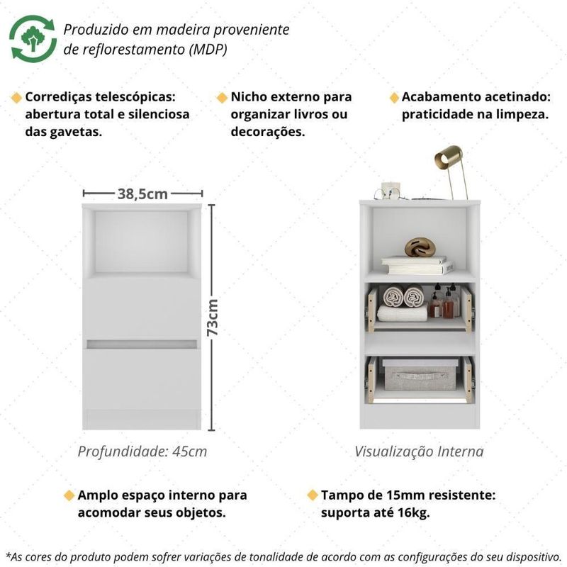 Mesa De Cabeceira 38,5cm Com 2 Gavetas Multimóveis Mp4395 BrancoDeixe o seu quarto mais elegante, organizado e acolhedor com a Mesa de Cabeceira 38,5cm com 2 Gavetas Multimóveis MP4395. Mais do que um simples móvel, ela é a combinação perfeita entre funcionalidade e estilo, trazendo praticidade para o seu dia a dia e charme para a decoração. Com design moderno e acabamento sofisticado, essa mesa de cabeceira foi pensada para quem valoriza ambientes bem cuidados e aconchegantes, transformando cada detalhe em um convite ao conforto. Além de complementar o visual do quarto, ela oferece o espaço ideal para manter seus objetos sempre à mão.Diferenciais:- Praticidade no dia a dia: 2 gavetas espaçosas com corrediças telescópicas, que deslizam suavemente e permitem maior aproveitamento interno.- Organização inteligente: nicho versátil para guardar livros, apoiar itens de uso frequente ou expor objetos decorativos.- Tampo resistente: suporta até 16kg, ideal para luminárias e outros itens decorativos.- Sustentável e durável: produzida em MDP 15mm proveniente de reflorestamento, contribuindo para um consumo mais consciente.- Acabamento acetinado: brilho suave (cerca de 20%) que valoriza a beleza do móvel e facilita a limpeza.Conteúdo da Embalagem:1 (uma) Mesa de CabeceiraManual de MontagemKit FerragemDimensões do Produto Montado:Altura: 73cm | Largura: 38,5cm | Profundidade: 45cm*Você pode consultar as medidas detalhadas na imagem técnica do produto.Observações Importantes:*As cores do produto podem sofrer variações de tonalidade de acordo com as configurações do seu dispositivo.*Imagem meramente ilustrativa. Decoração não acompanha o produto.*O produto será entregue desmontado e não disponibilizamos o de montagem. Acabamento: Finish Foil | Tonalidade: Branco | Material: MDP | Referência do Modelo: MP4395 | Coleção: Mesa Cabeceira | Instruções de Cuidado: Limpar com pano seco para retirar o pó. Não utilizar produtos químicos ou abrasivos a limpeza. Não aplicar lustra móveis. | Sistema de Montagem: O produto acompanha manual de montagem juntamente com kit ferragem. O produto será entregue desmontado e não disponibilizamos o de montagem. | Produto Composto por: 1 mesa de cabeceira, manual de montagem e kit ferragem. | Tamanho (L x A x P): 38,5 x 73 x 45 | Altura Montado: 73 | Largura Montado: | Profundidade Montado: 45 | Produto: Mesa de Cabeceira | Peso do Produto: 14 | Inclui Espelho: Não | Requer Montagem: Sim | Fabricante: Multimóveis | Quantidade de Mesas de Cabeceira: 1 | Tipo da Mesa de Cabeceira: N/A | RBN: 17100652011 | Com Gavetas: Sim | Quantidade de Gavetas: 2 | Altura (cm): 73 cm | Largura (cm): 38,5 cm | Profundidade (cm): 45 cm | Garantia do Fabricante: 3 | Produto Infantil: Não | Altura do Produto com Embalagem: 10 | Largura do Produto com Embalagem: 48 | Comprimento do Produto com Embalagem: 79 | Peso do Produto com Embalagem: 14 | Nome do Produto no Fornecedor: Mesa de Cabeceira 38,5cm com 2 Gavetas Multimóveis MP4395 Branco | Descrição do Tamanho: (L x A x P): 38,5 x 73 x 45 cm | Tempo de Garantia: 3 meses | Estado de Origem: RS | Produto precisa de Montagem?: Sim, sugerimos a contratação do nosso de montagem (para os CEPs em que o está disponível) ou de algum experiente de sua preferência | Destaque 1: Produzida em MDP com acabamento acetinado: durabilidade e facilidade na limpeza. | Destaque 2: Corrediças telescópicas: abertura total e silenciosa das gavetas. | Destaque 3: Nicho para colocação de livros ou objetos decorativos. | Destaque 4: Tamanho do produto montado (L x A x P): 38,5 x 73 x 45 cm | Destaque 5: Tampo de 15mm que suporta até 16kg. | Estilo: Moderno | Material das dobradiças: N/A | Com Corrediças: Sim | Material das corrediças: Telescópicas | Com Alça: Não | Material do cabo: N/A | Com Bandeja removível: Não | Com Prateleiras: Não | Com Portas: Não | Com Rodas: Não | Marca: Multimóveis | É Personalizado: Não | Inclui Ferramentas de montagem: Sim | Origem: BR (Origem) | Tipo de Material: Madeira | Baterias são necessárias?: Não | Certificação de teste externa: Não aplicável | Is Fragile: Não | Dimensões do item P x L x A: depth#value=45;depth#unit=centimeters;width#value=38,5;width#unit=centimeters;height#value=73;height#unit=centimeters | Quantidade de itens: 1 | da peça: | Quantidade de Caixas de Embalagem: 01 | Peso do item: unit=kilograms;value=14 | Tipo de Garantia: Garantia do Fabricante | Montagem: Necessita Montagem | Inclui manual de montagem: Sim | País de Origem: | Componentes incluídos: Guia de montagem | Palavras-chave: mesinhas de cabeceira brancas, mesa de cabeceira 30 cm, modelos de mesa de cabeceira, movel lado da cama, mesas de cabeceira de madeira, quarto casal, mesas de cabeceira, moderno lindo, moderno lindo, , , mesa cabeceira, branco, rustico, preto Cor: Branco