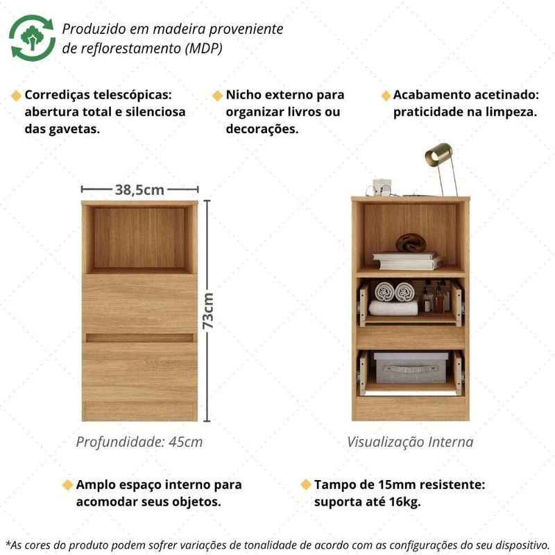 Mesa De Cabeceira 38,5cm Com 2 Gavetas Multimóveis Mp4395 MadeiradoDeixe o seu quarto mais elegante, organizado e acolhedor com a Mesa de Cabeceira 38,5cm com 2 Gavetas Multimóveis MP4395. Mais do que um simples móvel, ela é a combinação perfeita entre funcionalidade e estilo, trazendo praticidade para o seu dia a dia e charme para a decoração. Com design moderno e acabamento sofisticado, essa mesa de cabeceira foi pensada para quem valoriza ambientes bem cuidados e aconchegantes, transformando cada detalhe em um convite ao conforto. Além de complementar o visual do quarto, ela oferece o espaço ideal para manter seus objetos sempre à mão.Diferenciais:- Praticidade no dia a dia: 2 gavetas espaçosas com corrediças telescópicas, que deslizam suavemente e permitem maior aproveitamento interno.- Organização inteligente: nicho versátil para guardar livros, apoiar itens de uso frequente ou expor objetos decorativos.- Tampo resistente: suporta até 16kg, ideal para luminárias e outros itens decorativos.- Sustentável e durável: produzida em MDP 15mm proveniente de reflorestamento, contribuindo para um consumo mais consciente.- Acabamento acetinado: brilho suave (cerca de 20%) que valoriza a beleza do móvel e facilita a limpeza.Conteúdo da Embalagem:1 (uma) Mesa de CabeceiraManual de MontagemKit FerragemDimensões do Produto Montado:Altura: 73cm | Largura: 38,5cm | Profundidade: 45cm*Você pode consultar as medidas detalhadas na imagem técnica do produto.Observações Importantes:*As cores do produto podem sofrer variações de tonalidade de acordo com as configurações do seu dispositivo.*Imagem meramente ilustrativa. Decoração não acompanha o produto.*O produto será entregue desmontado e não disponibilizamos o de montagem. Acabamento: Finish Foil | Tonalidade: Branco | Material: MDP | Referência do Modelo: MP4395 | Coleção: Mesa Cabeceira | Instruções de Cuidado: Limpar com pano seco para retirar o pó. Não utilizar produtos químicos ou abrasivos a limpeza. Não aplicar lustra móveis. | Sistema de Montagem: O produto acompanha manual de montagem juntamente com kit ferragem. O produto será entregue desmontado e não disponibilizamos o de montagem. | Produto Composto por: 1 mesa de cabeceira, manual de montagem e kit ferragem. | Tamanho (L x A x P): 38,5 x 73 x 45 | Altura Montado: 73 | Largura Montado: | Profundidade Montado: 45 | Produto: Mesa de Cabeceira | Peso do Produto: 14 | Inclui Espelho: Não | Requer Montagem: Sim | Fabricante: Multimóveis | Quantidade de Mesas de Cabeceira: 1 | Tipo da Mesa de Cabeceira: N/A | RBN: 17100652011 | Com Gavetas: Sim | Quantidade de Gavetas: 2 | Altura (cm): 73 cm | Largura (cm): 38,5 cm | Profundidade (cm): 45 cm | Garantia do Fabricante: 3 | Produto Infantil: Não | Altura do Produto com Embalagem: 10 | Largura do Produto com Embalagem: 48 | Comprimento do Produto com Embalagem: 79 | Peso do Produto com Embalagem: 14 | Nome do Produto no Fornecedor: Mesa de Cabeceira 38,5cm com 2 Gavetas Multimóveis MP4395 Branco | Descrição do Tamanho: (L x A x P): 38,5 x 73 x 45 cm | Tempo de Garantia: 3 meses | Estado de Origem: RS | Produto precisa de Montagem?: Sim, sugerimos a contratação do nosso de montagem (para os CEPs em que o está disponível) ou de algum experiente de sua preferência | Destaque 1: Produzida em MDP com acabamento acetinado: durabilidade e facilidade na limpeza. | Destaque 2: Corrediças telescópicas: abertura total e silenciosa das gavetas. | Destaque 3: Nicho para colocação de livros ou objetos decorativos. | Destaque 4: Tamanho do produto montado (L x A x P): 38,5 x 73 x 45 cm | Destaque 5: Tampo de 15mm que suporta até 16kg. | Estilo: Moderno | Material das dobradiças: N/A | Com Corrediças: Sim | Material das corrediças: Telescópicas | Com Alça: Não | Material do cabo: N/A | Com Bandeja removível: Não | Com Prateleiras: Não | Com Portas: Não | Com Rodas: Não | Marca: Multimóveis | É Personalizado: Não | Inclui Ferramentas de montagem: Sim | Origem: BR (Origem) | Tipo de Material: Madeira | Baterias são necessárias?: Não | Certificação de teste externa: Não aplicável | Is Fragile: Não | Dimensões do item P x L x A: depth#value=45;depth#unit=centimeters;width#value=38,5;width#unit=centimeters;height#value=73;height#unit=centimeters | Quantidade de itens: 1 | da peça: | Quantidade de Caixas de Embalagem: 01 | Peso do item: unit=kilograms;value=14 | Tipo de Garantia: Garantia do Fabricante | Montagem: Necessita Montagem | Inclui manual de montagem: Sim | País de Origem: | Componentes incluídos: Guia de montagem | Palavras-chave: mesinhas de cabeceira brancas, mesa de cabeceira 30 cm, modelos de mesa de cabeceira, movel lado da cama, mesas de cabeceira de madeira, quarto casal, mesas de cabeceira, moderno lindo, moderno lindo, , , mesa cabeceira, branco, rustico, preto Cor: Madeirado