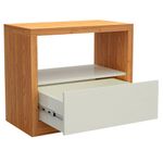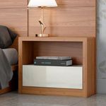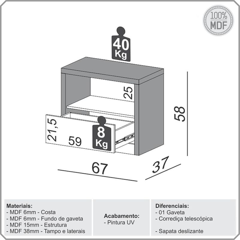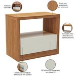 Conheça a Mesa de Cabeceira Cameron, da Lyam Decor, e descubra uma peça que combina design moderno e robustez em um único móvel. Com uma gaveta discreta e um nicho aberto, essa mesa lateral para quarto é perfeita para quem busca funcionalidade sem abrir mão da estética, já que ela oferece um espaço prático para organizar seus itens essenciais, enquanto o acabamento elegante e linhas suaves adicionam um toque contemporâneo ao quarto. Ideal para criar um ambiente acolhedor e estiloso, essa mesa de cabeceira é uma escolha inteligente para quem valoriza tanto a beleza quanto a praticidade. Transforme seu espaço com sofisticação e versatilidade. Adicione ao seu carrinho e surpreenda-se! Dimensões total do produto (L x A x P) 67 x 58 x 37 cm Medidas Internas Gavetas (L x A): 59 x 21,5 cm Altura do nicho: 25 cm Características: Estrutura em 100% MDF 15mm, tampo e laterais 38mm. Peças na tonalidade Freijó e Off White com acabamento em pintura UV. 01 gaveta com corrediças telescópica, sem puxador. 01 nicho para itens decorativos. Suporta até 48 kg distribuídos, conforme manual. - Produto entregue desmontado, acompanha manual de montagem. - Este produto deve ser limpo com pano macio e seco. Não utilize produtos abrasivos como álcool e detergente, assim como esponjas rígidas ou palha de aço. - Proteja a superfície do móvel de objetos que transmitam calor ou umidade. Observações importantes: - Produto para uso residencial em ambiente interno, não devendo ficar exposto diretamente ao sol, calor e umidade excessivos. - Pode haver alguma diferença de tonalidade entre a imagem e o produto real, por conta do tratamento de imagens e a calibração de cores do seu monitor. - As imagens são meramente ilustrativas, não acompanham objetos de decoração e eletrônicos. - Ao receber a mercadoria, o cliente deve verificar as condições da embalagem, caso haja alguma avaria não assine o comprovante de recebimento. - Montagem, desmontagem e outras instalações serão de responsabilidade do cliente. Não nos responsabilizamos, no ato da entrega, por subir escadas/elevadores ou pelo transporte por guincho em apartamentos. Eventuais despesas são de responsabilidade do comprador. - Confira as dimensões do produto e certifique-se de que passará normalmente por supostos elevadores, portas, escadas e/ou corredores de sua residência.