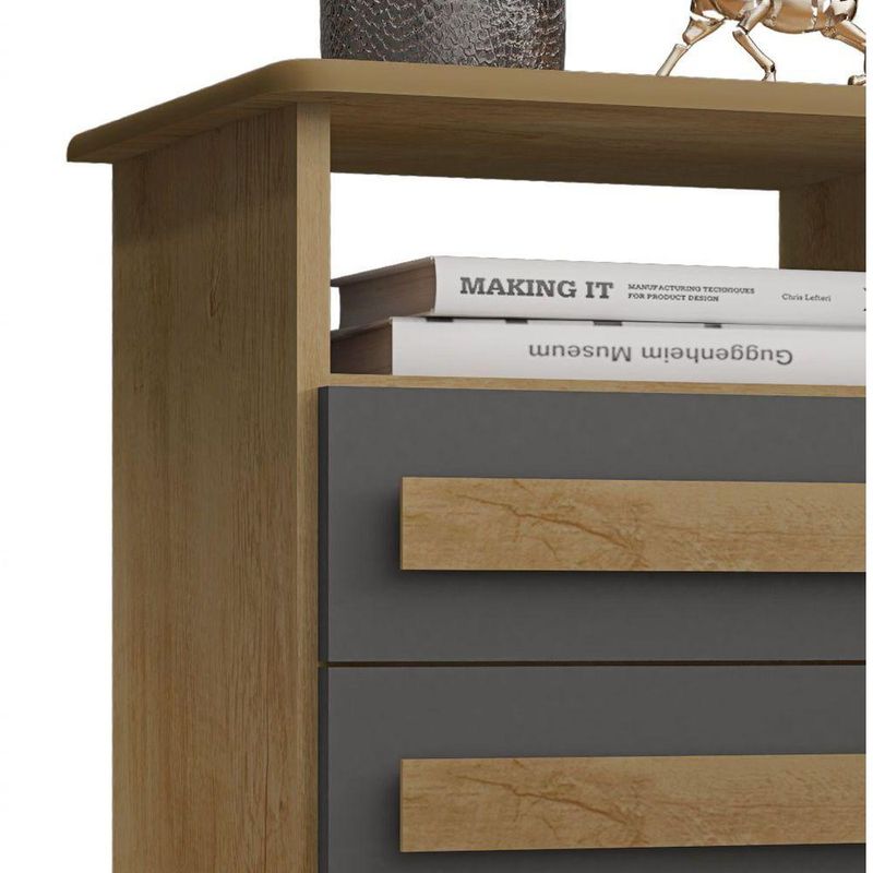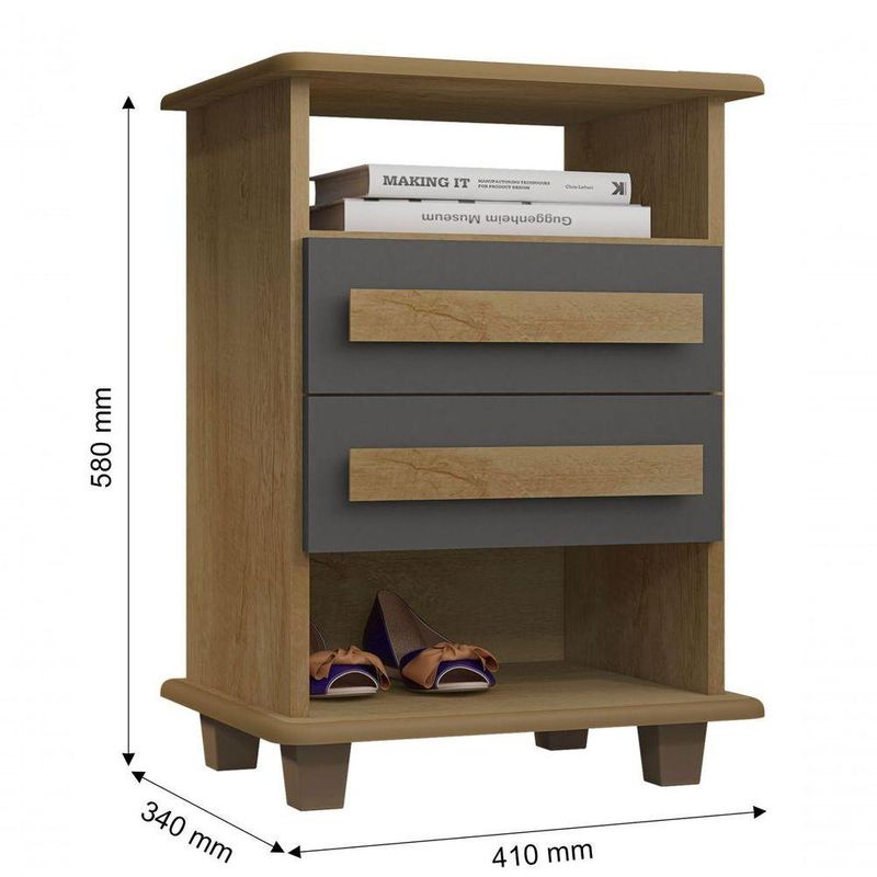 Mesa De Cabeceira Turim 2 Gavetas Cinamomo Com Grafite - Rv MóveisA Mesa de Cabeceira Turim 2 Gavetas - RV Móveis é uma ótima opção para auxiliar na organização do quarto e dar apoio a itens que precisam ficar ao lado da cama, como: abajur, despertador, relógio entre outros. Conta com gavetas com puxadores em MDF e corrediças telescópicas.Dimensões do Produto Montado:Altura: 58 cmLargura: 41 cmProfundidade: 34 cmObservações:- 02 gavetas;- Corrediças telescópicas;- Tampo e base em MDF de 15mm;- Puxadores em MDF;- Pintura Ultravioleta com acabamento fosco.