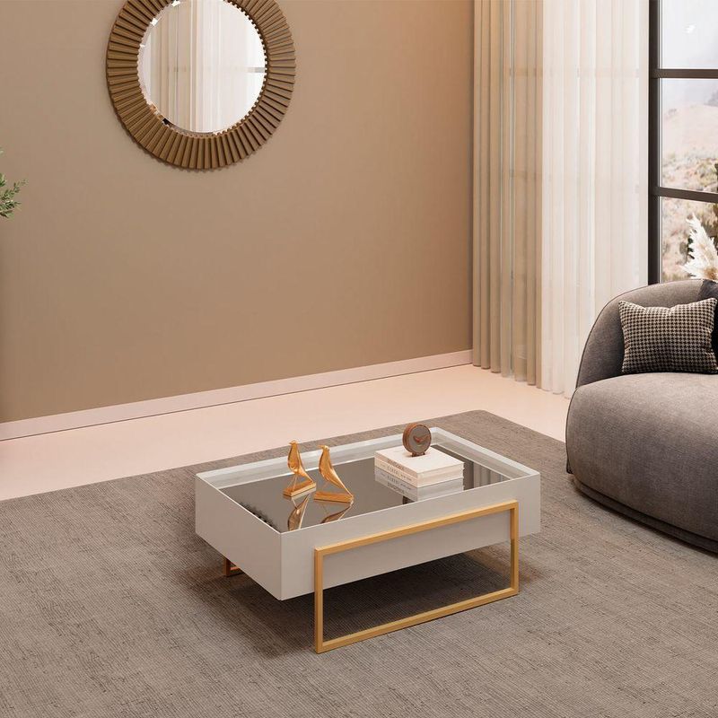 Mesa De Centro Kika De Sala Hall Moderna Com Espelho Pes Em Metal BaliCom design moderno e sofisticado, a Mesa de Centro Kika é o complemento perfeito para deixar sua sala mais elegante e funcional.Inspirada na mesma linha do Aparador Kika, ela combina perfeitamente em ambientes contemporâneos, unindo charme, praticidade e requinte.Seu tampo conta com espelho aplicado, um detalhe que adiciona brilho e destaque à decoração, refletindo a luz e ampliando a sensação de espaço.As laterais chanfradas e os pés metálicos com pintura epóxi dourada reforçam o visual requintado do móvel, criando uma combinação equilibrada entre o moderno e o clássico.Dimensões:Altura: 31,5cmLargura: 91,5cmProfundidade: 49cmObservações:- Produzida em MDF e MDP de reflorestamento, com excelente resistência- Acabamento em impressão UV alto brilho e texturizada- Tampo com espelho aplicado- Laterais chanfradas com acabamento refinado- Ideal para salas de estar modernas e sofisticadas