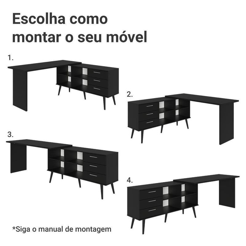 Mesa De Estudos Em L 3 Gavetas Preto Lisboa Madesa Organização, conforto e estilo para o seu espaço de estudos.A Escrivaninha Lisboa da Madesa foi pensada para facilitar a sua rotina, seja no quarto, no home office ou em qualquer cantinho da casa dedicado ao aprendizado. Com design moderno e formato em L, ela se adapta facilmente ao ambiente, oferecendo quatro possibilidades de montagem para melhor aproveitamento do espaço.Seu acabamento preto é elegante e atemporal, combinando com diversos estilos de decoração. A estrutura é resistente, ideal para acompanhar as tarefas do dia a dia com praticidade e durabilidade.A mesa conta com três gavetas amplas para guardar cadernos, livros, materiais escolares e itens de papelaria, além de nichos abertos que facilitam o acesso aos objetos de uso frequente.A superfície espaçosa permite estudar com mais conforto, organizar o computador, livros e acessórios, mantendo tudo ao seu alcance.Medidas totais:- Em L: 74 cm de altura x 150 cm de um lado x 152 cm do outro- Reta: 74 cm de altura x 255 cm de largura x 60 cm de profundidade totalO que você recebe:Uma (1) Escrivaninha com três gavetas e quatro nichosManual de montagem e ferragensCódigo do produto: XAMDFC0100088NÉ importante saber:- Imagens meramente ilustrativas, a decoração não acompanha o produto- A Madesa não disponibiliza de montagem- O produto segue com manual de instalação e todas as ferragens necessárias para sua montagemA Madesa se dedica à sustentabilidade com várias iniciativas: temos uma usina própria que gera energia para uma das fábricas. Priorizamos fornecedores responsáveis com o meio ambiente. Todo o plástico na produção é reciclado, e as sobras também são reaproveitadas. Investimos no desenvolvimento de nossos colaboradores e em ações que beneficiem a comunidade.