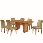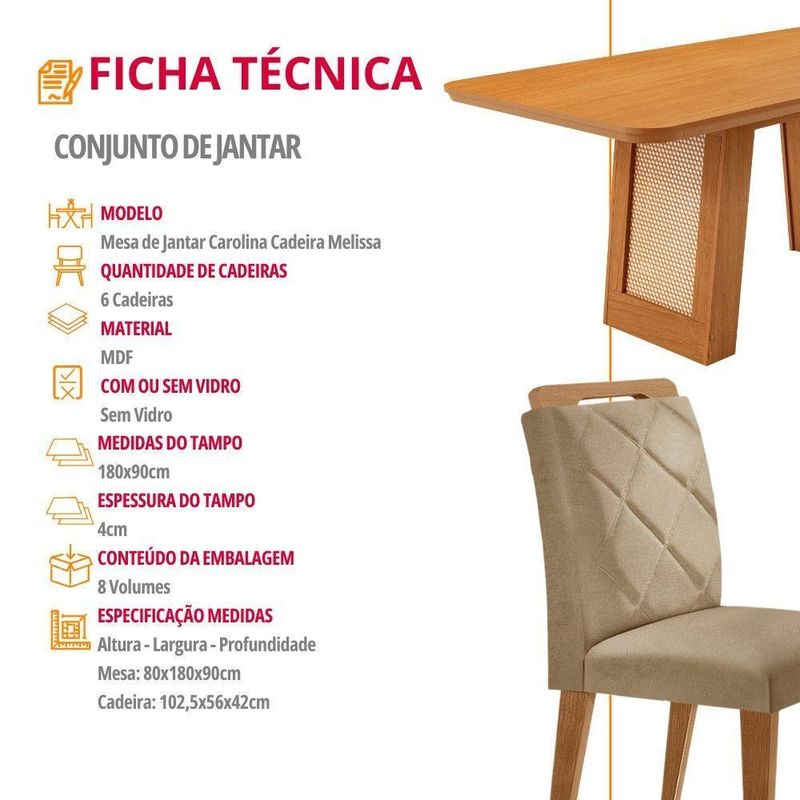 Mesa De Jantar Carolina Com 6 Cadeiras Moderna Mobilia Turim 07/ LaminadoO conjunto formado pela Cadeira Melissa e a Mesa Carolina e a combinacao perfeita de sofisticacao, conforto e design contemporaneo.A Mesa Carolina, com tampo laminado de 180 cm, complementa o conjunto com estilo e praticidade. Seu diferencial esta na base com detalhes que imitam rattan, adicionando um toque natural e elegante ao ambiente. Para complementar com estilo e conforto, as Cadeiras Melissa sao a escolha ideal. Com assentos e encostos estofados, elas proporcionam um conforto excepcional mesmo durante longos periodos de uso. O toque final fica por conta dos bordados no encosto, um detalhe especial que traz charme e sofisticacao ao conjunto. Caracteristicas: Marca: Moderna Mobilia Modelo: Carolina/Melissa Material: MDF Dimensoes da Mesa: Altura: 80 cm Largura: 180 cm Profundidade: 90 cm Dimensoes da Cadeira: Altura: 102,5 cm Largura: 56 cm Profundidade: 42 cm Conteudo da embalagem:, 01 Mesa de Jantar Carolina 06 Cadeiras Garantia do Fabricante: 03 meses. Observacoes: Os objetos que ambientam as fotos nao acompanham o produto. Nao disponibilizamos a montagem do produto. O produto acompanha manual de montagem. Nao nos responsabilizamos por danos no produto causados por montagem de qualquer outra forma que nao seja a descrita no manual. Verifique as dimensoes do produto e certifique-se que o percurso que ele fara ate o de uso permite sua passagem. A Moderna Mobilia reserva o direito de alterar as especificacoes tecnicas sem previo aviso. As medidas contidas no site podem sofrer variacoes de acordo com a montagem, tipo de costura etc. A montagem sera de responsabilidade do comprador. Nao nos responsabilizamos, no ato da , por subir escadas/elevadores em apartamentos. Eventuais despesas sao de responsabilidade do comprador. As tonalidades das cores podem sofrer alteracao de acordo com a configuracao de cada monitor.