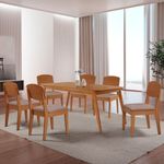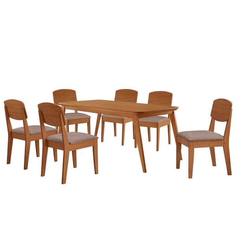 Mesa De Jantar Copper 180cm Tampo Mdf 6 Cadeiras Moderna Linho Capuccino/naturale/naturaleA Mesa Copper e uma peca que traz elegancia e sofisticacao para qualquer ambiente. Sua base em madeira oferece uma estrutura resistente e duravel, enquanto o tampo em MDF e acabamento canto copo garante um visual refinado. Com design sofisticado e estrutura solida, ela complementa o ambiente com um toque natural e acolhedor.A Cadeira Copper combina design contemporaneo e conforto, com encosto em MDF moldado que oferece suporte ergonomico ideal. Seu estofado acolhedor garante um assento confortavel, enquanto o acabamento refinado e detalhes sofisticados valorizam seu visual, tornando-a perfeita para ambientes modernos e elegantes. Caracteristicas: Marca: Moderna Mobilia Modelo: Copper / Copper Material: Base Madeira / Tampo MDF / Cadeira MDF Tampo: Canto Copo Sem Vidro Dimensoes da Cadeira: Altura: 91 cm Largura: 45 cm Profundidade: 54 cm Dimensoes Mesa: Altura: 80 cm Largura: 180 cm Profundidade: 90 cm Garantia do Fabricante: 03 meses. Observacoes: Os objetos que ambientam as fotos nao acompanham o produto. Nao disponibilizamos a montagem do produto. O produto acompanha manual de montagem. Nao nos responsabilizamos por danos no produto causados por montagem de qualquer outra forma que nao seja a descrita no manual. Verifique as dimensoes do produto e certifique-se que o percurso que ele fara ate o local de uso permite sua passagem. A Moderna Mobilia reserva o direito de alterar as especificacoes tecnicas sem previo aviso. As medidas contidas no site podem sofrer variacoes de acordo com a montagem, tipo de costura etc. A montagem sera de responsabilidade do comprador. Nao nos responsabilizamos, no ato da entrega, por subir escadas/elevadores em apartamentos. Eventuais despesas sao de responsabilidade do comprador. As tonalidades das cores podem sofrer alteracao de acordo com a configuracao de cada monitor.