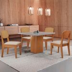 Mesa De Jantar Eloise 90cm Tampo Mdf 4 Cadeiras Moderna Veludo Creme /nat/off/serig. OffConjunto Sala de Jantar Mesa Eloise e Cadeira CopperA Mesa Eloise e uma peca de design sofisticado, com tampo em MDF e Vidro Canto Copo, que adiciona elegancia e modernidade ao ambiente. Seu grande destaque esta nas bases com formato de torres, que trazem um visual marcante. A Cadeira Copper Premium combina design contemporaneo e conforto, com encosto em MDF Vidro moldado que proporciona suporte ergonomico ideal. Seu estofado macio garante um assento aconchegante, enquanto o acabamento refinado e os detalhes sofisticados no encosto, que imitam rattan, valorizam seu visual, tornando-a perfeita para ambientes modernos e elegantes. Caracteristicas: Marca: Moderna Mobilia Modelo: Eloise / Diane Material: MDF Tampo: Canto Copo Com Vidro Dimensoes da Cadeira: Altura: 91 cm Largura: 45 cm Profundidade: 54 cm Dimensoes Mesa: Altura: 80 cm Largura: 90 cm Profundidade: 90 cm Garantia do Fabricante: 03 meses. Observacoes: Os objetos que ambientam as fotos nao acompanham o produto. Nao disponibilizamos a montagem do produto. O produto acompanha manual de montagem. Nao nos responsabilizamos por danos no produto causados por montagem de qualquer outra forma que nao seja a descrita no manual. Verifique as dimensoes do produto e certifique-se que o percurso que ele fara ate o local de uso permite sua passagem. A Moderna Mobilia reserva o direito de alterar as especificacoes tecnicas sem previo aviso. As medidas contidas no site podem sofrer variacoes de acordo com a montagem, tipo de costura etc. A montagem sera de responsabilidade do comprador. Nao nos responsabilizamos, no ato da entrega, por subir escadas/elevadores em apartamentos. Eventuais despesas sao de responsabilidade do comprador. As tonalidades das cores podem sofrer alteracao de acordo com a configuracao de cada monitor.