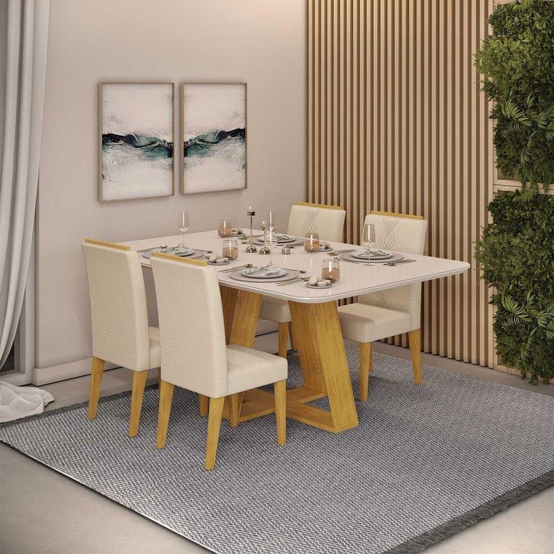 Mesa De Jantar Kiara Tampo Chanfrado Curvo Madeira E Vidro Pintado Cedro Com Off WhiteCom design contemporâneo e acabamento sofisticado, a Mesa de Jantar Kiara é perfeita para transformar sua sala de jantar em um ambiente elegante e acolhedor.Seu tampo em vidro oferece leveza visual, além de facilitar a limpeza e valorizar o estilo do móvel.A base central robusta, com usinagem em padrões geométricos, proporciona firmeza à estrutura e destaca a personalidade da peça.Se adapta com facilidade a diferentes estilos de cadeiras, sendo perfeita para ambientes modernos e integrados.Dimensões:Altura: 80cmLargura: 160cmProfundidade: 90cmObservações:- Tampo em vidro com acabamento refinado- Base central usinada com visual imponente- Estrutura firme e de alta durabilidade- Combinação perfeita entre sofisticação e praticidade
