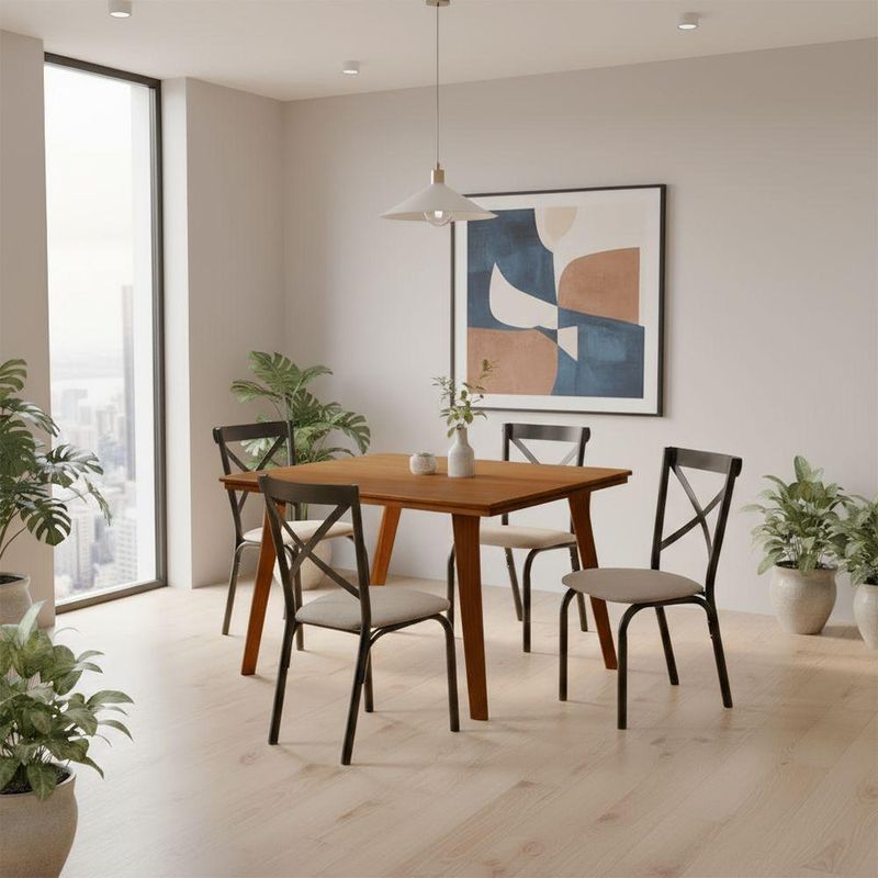 Mesa De Jantar Millena 80x80 Em Madeira Maciça Estilo Contemporâneo CastanhoA Mesa de Jantar Millena é a escolha ideal para quem busca unir sofisticação, resistência e funcionalidade em um só móvel. Com design contemporâneo, ela valoriza o ambiente com linhas elegantes e acabamento refinado, sendo perfeita para compor salas de jantar, áreas gourmet ou espaços integrados com bom gosto e modernidade.Fabricada em madeira maciça, a mesa garante excelente durabilidade e estabilidade, além de proporcionar um toque acolhedor e natural à decoração. Seu amplo tampo acomoda confortavelmente várias pessoas, tornando-a ideal para refeições em família ou encontros sociais.Características:Modelo: MillenaTipo: Mesa de JantarMaterial da Estrutura: Madeira MaciçaCor: CastanhoDesign elegante e funcionalDimensões Aproximadas:Altura: 78 cmLargura: 80 cmProfundidade: 80 cmOBS: Produto: Mesa de Jantar Millena; outros objetos presentes nas imagens ambientadas não acompanham o produto.ATENÇÃO: As imagens são meramente ilustrativas e podem sofrer variações de cor e pequenos detalhes de acordo com o seu monitor, iluminação do ambiente e percepção visual.Mesa de Jantar Millena 80x80 em Madeira Maciça Estilo Contemporâneo Castanho