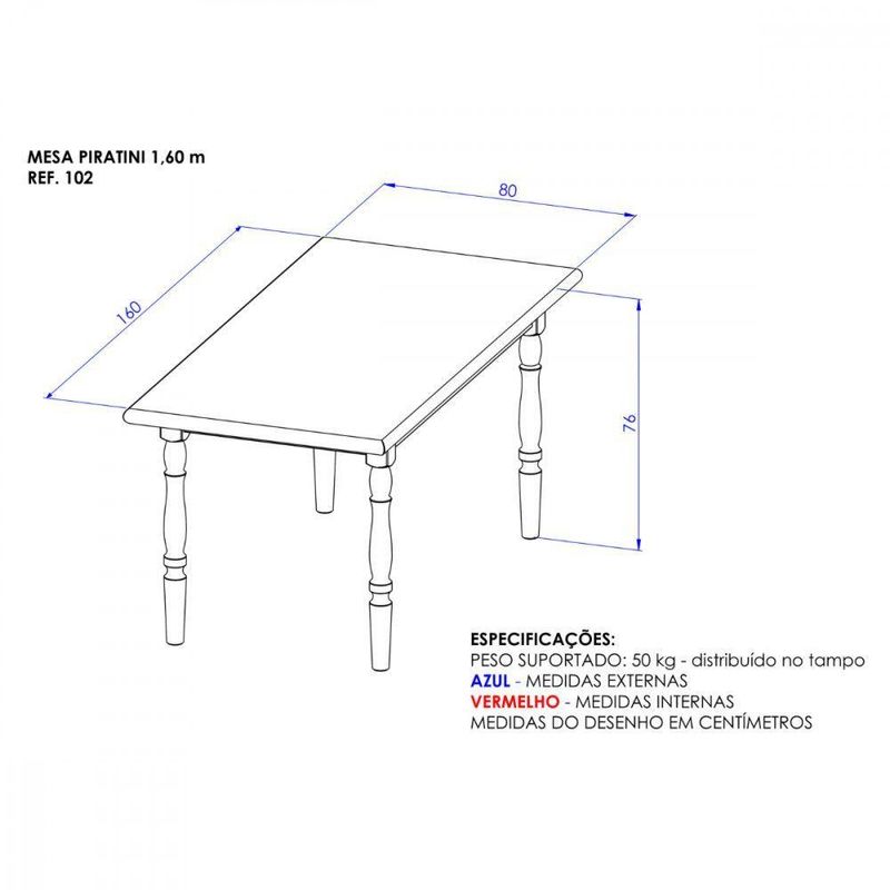Mesa De Jantar Piratini 160x80 Mel Viero MelEla ficara perfeita em sua sala de jantar. Venha conferir a Mesa de Jantar Piratini da Viero!Dimensoes:Altura: 76 cm | Largura: 160 cm | Comnto: 80 cmCaracteristicas:- Estrutura em madeira macica com tampo em MDP revestido de lamina de madeira- Pintura/Acabamento: Brilhante- Para no maximo 6 cadeiras (nao inclusas)- Nao possui sapatas- Suporte de peso ate 50 kg- Garantia de 3 meses** Imagens ilustrativas. Objetos nao acompanham o produto.** O produto e enviado desmontado.AVISO: Esclarecemos que a Opcao Moveis se responsabilizara pela dos produtos adquiridos ate a porta de entrada (casas) ou portaria (predios ou condominios) do endereco indicado, ou seja: e de total responsabilidade do cliente a montagem, desmontagem e instalacao do produto adquirido. Para evitar futuros desagrados ou imprevistos com a , tambem e necessario que o cliente confira as dimensoes do produto escolhido, antes de finalizar a compra, devendo certificar-se de que a mercadoria passara normalmente por elevador, porta, escada e corredor.