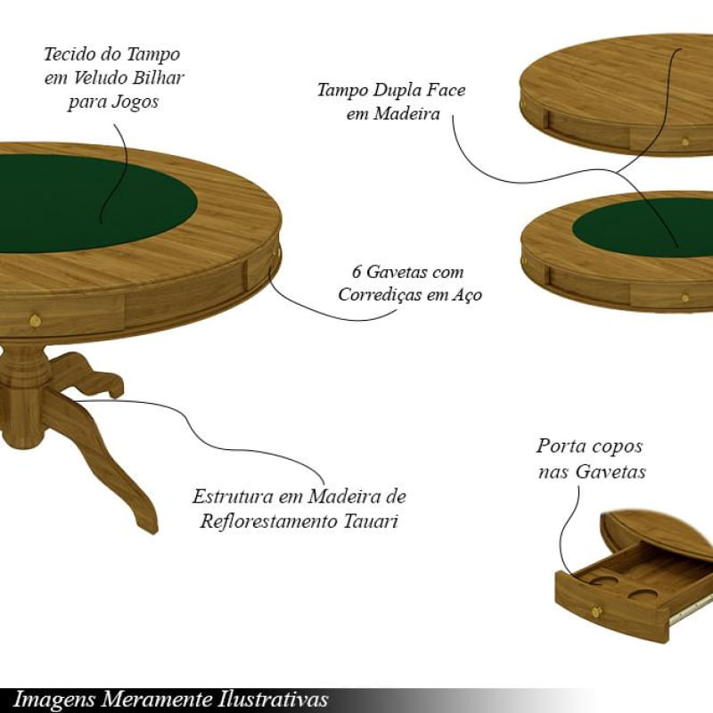 Mesa de Jogos Carteados Bellagio: Elevando Sua Experiência de Jogo para o Próximo Nível! Se você busca o ápice em luxo, elegância e diversão em seus momentos de jogos carteados, a Mesa de Jogos Carteados Bellagio é a escolha definitiva. Inspirada no glamour dos cassinos de Las Vegas, esta mesa foi meticulosamente projetada para proporcionar uma experiência única aos entusiastas de jogos. Gavetas com Porta-Copos: Desfrute de jogos sem se preocupar com derramamentos! A Bellagio possui gavetas convenientes com porta-copos integrados, proporcionando espaço adicional para armazenar seus itens essenciais de jogo e garantindo que suas bebidas estejam sempre ao alcance. Tampo Reversível: Mude o cenário do seu jogo com facilidade! O tampo reversível da Bellagio oferece versatilidade, permitindo que você escolha entre uma superfície para jogos de cartas e uma superfície elegante para outras atividades, como jantares ou reuniões. Não comprometa sua paixão por jogos carteados. Faça uma declaração de estilo e sofisticação com a Mesa de Jogos Carteados Bellagio. Adquira a sua agora e transforme seus momentos de jogo em experiências memoráveis! Dimensões do Produto: Largura: 140cm; Altura: 78cm; Profundidade: 140cm; Característica do Produto: Estrutura: Madeira Maciça de Tauari; Acabamento: Pintura em Mel; Tampo: Reversível (Dupla Face) em Tecido Verde/ Madeira Lisa Mel da cor da mesa; Material dos Pés: Madeira Maciça de Tauari; Detalhes: 6 Gavetas em Madeira com Puxadores Metalizados, Porta Copos; Conteúdo da Embalagem: 1 Mesa de Carteado; Necessita de Montagem: Sim, Montagem Simples (Parafusar o Tampo com a Base); Instruções/Cuidado: Utilizar um pano levemente umedecido com água, seguido de pano seco. Evitar exposição ao sol, para que o produto não sofra alteração nas cores. Não limpar com escovas ou produtos abrasivos. Observações Importantes: - As imagens são meramente ilustrativas e não acompanham objetos de decoração e eletros - Pode haver alguma diferença de tonalidade entre a imagem e o produto, por conta do tratamento de imagens e a calibração de cores da sua tela. - Todos os nossos produtos são enviados devidamente embalados e com total segurança - Confira as dimensões do produto no momento da compra e certifique-se de que passará normalmente por elevadores, portas, escadas e/ou corredores, evitando assim futuros desagrados ou imprevistos com a entrega do produto.