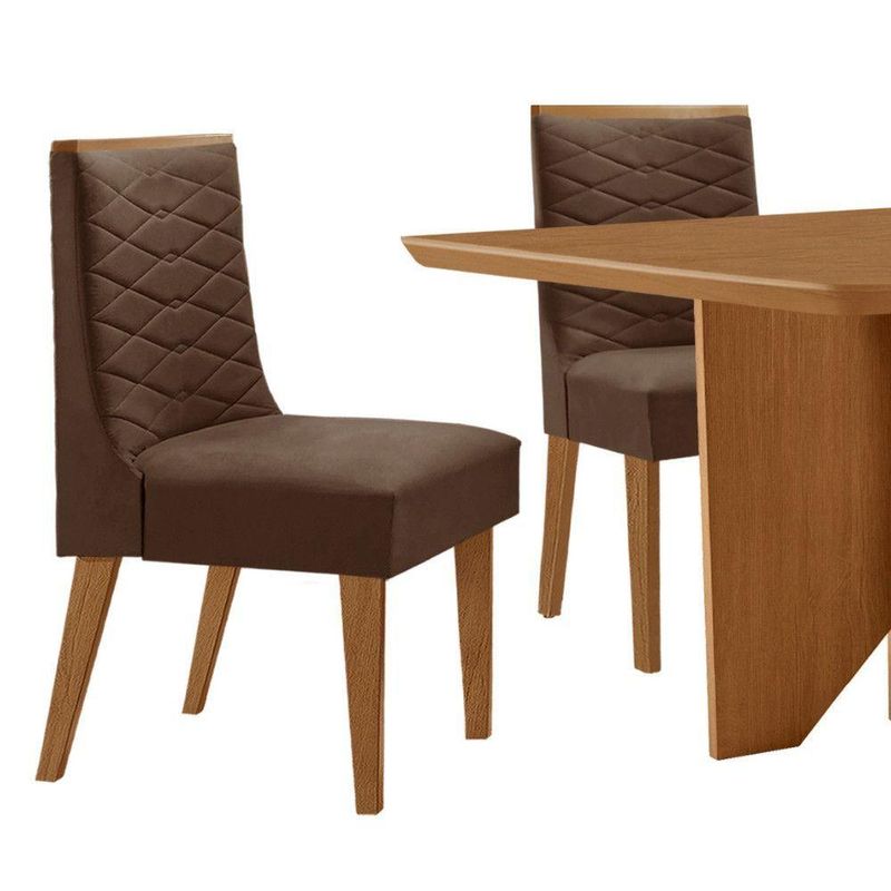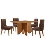 Mesa Evora 90 Mdf Canto Copo E Com 4 Cadeiras Safira Veludo Marrom NaturalleMesa de Jantar Evora 90cm MDF Canto copo e com 4 Cadeiras SafiraA Mesa Evora com as Cadeiras Safira e uma combinacao perfeita para quem busca elegancia e conforto para um espaco compacto. A mesa destaca-se por sua base unica e sofisticada, trazendo um toque de modernidade e estilo ao ambiente, sem ocupar muito espaco. Ja as Cadeiras Safira complementam o conjunto com assentos e encostos estofados, oferecendo um conforto ideal para longos periodos de uso. Um detalhe especial e o requinte dos bordados, tanto na parte frontal quanto na traseira das cadeiras, que adiciona um charme extra ao conjunto e enriquece a decoracao do espaco. Essa combinacao e ideal para criar uma atmosfera acolhedora e sofisticada para seu ambiente. Caracteristicas: Marca: Moderna Mobilia Mesa e Cadeiras Tampo Canto Copo Tipo de Acabamento: Pintura UV Material da Estrutura: 100 MDF Possui Vidro: Nao Dimensoes da Mesa: Altura: 80cm Largura: 90cm Profundidade: 90cm Dimensoes das Cadeiras: Altura: 99cm Largura: 45cm Profundidade: 60cm Garantia do Fornecedor: 3 meses Informacoes Importantes: As tonalidades das cores podem sofrer alteracao de acordo com a configuracao de cada monitor. Os objetos que ambientam as fotos nao acompanham o produto. Nao disponibilizamos a montagem do produto. Nao nos responsabilizamos por danos no produto causado por montagem. Verifique as dimensoes do produto e certifique-se que o percurso que ele fara ate o local de uso permite sua passagem. Para mais informacoes confira as politicas de entrega do site. Favor verificar o produto no ato da entrega e em caso de problemas decorrentes no transporte (arranhados, quebra, batida, amassados) deve-se efetuar a ressalva na nota fiscal para conhecimento da transportadora e comunicar imediatamente a loja. Moderna Mobilia reserva o direito de alterar as especificacoes tecnicas sem previo aviso. As medidas contidas no site podem sofrer variacoes de acordo com a montagem, tipo de costura etc.