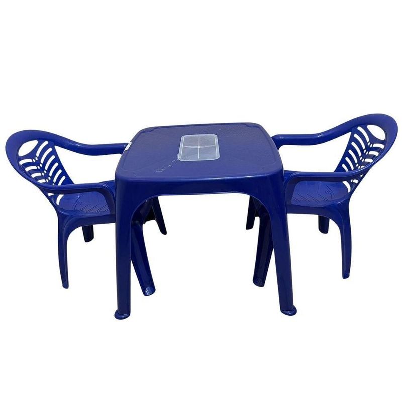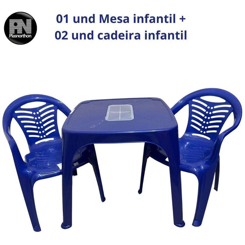 Mesa Infantil Azul + 02 Cadeira Infantil Plasnorthon KitContem:01 mesa infantil + 02 cadeira infantil.A Mesa Infantil de Plástico C/ Porta Objetos da marca Plasnorthon é perfeita para proporcionar diversão e praticidade para as crianças.Com altura de 57 cm e formato quadrado, a mesa oferece um espaço confortável para as atividades dos pequenos.Feita em plástico resistente, é fácil de limpar e suporta até 10 kg.Além disso, possui um porta objetos para guardar brinquedos e materiais de desenho.Recomendada para crianças a partir de 3 anos, essa mesa é ideal para estimular a criatividade e organização dos pequenos. Aproveite essa oportunidade e garanta já a sua!Poltrona Infantil: Conforto e diversão se unem nesta poltrona especialmente projetada para os pequenos. Feita com materiais seguros e duráveis, proporciona um lugar aconchegante para ler, brincar ou relaxar.