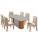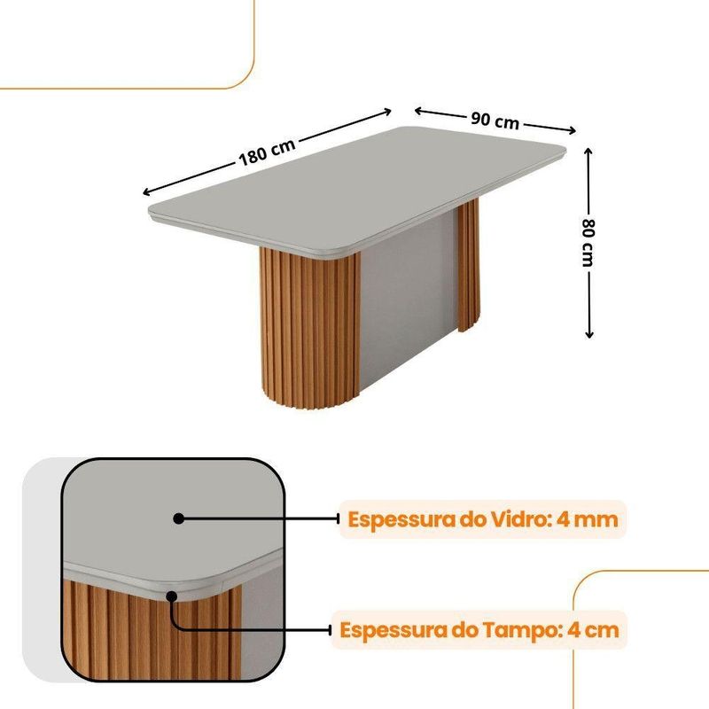 Mesa Jantar Aspen Tampo Mdf Vidro 6 Cadeiras Eloise Moderna Veludo Creme/off White/Apresentamos a nossa Mesa Aspen e as sofisticadas Cadeiras Eloise, um elegante conjunto de sala de jantar que traz sofisticacao e modernidade ao seu ambiente.A mesa se destaca com sua base com detalhes ripados, que adiciona um toque unico, enquanto as cadeiras, totalmente estofadas e com bordados, oferecem conforto e estilo. As alcas proporcionam um visual moderno e diferenciado. Inspirado nas montanhas de Aspen, este conjunto e ideal para criar um ambiente acolhedor e convidativo em sua casa. Nao perca a chance de transformar sua sala de jantar!Caracteristicas:Marca: Moderna MobiliaModelo: Aspen/EloiseMaterial 100 MDFTampo: Canto Copo / Com VidroAs cadeiras sao revestidas com tecidos de alta qualidade.Dimensoes da Cadeira:Altura: 99 cmLargura: 60 cmProfundidade: 45 cmDimensoes Mesa:Altura: 80 cmLargura: 180 cmProfundidade: 90 cmPeso: 119 KgGarantia do Fabricante: 03 meses.Observacoes:Os objetos que ambientam as fotos nao acompanham o produto.Nao disponibilizamos a montagem do produto.O produto acompanha manual de montagem. Nao nos responsabilizamos por danos no produto causados por montagem de qualquer outra forma que nao seja a descrita no manual.Verifique as dimensoes do produto e certifique-se que o percurso que ele fara ate o de uso permite sua passagem.As medidas contidas no site podem sofrer variacoes de acordo com a montagem, tipo de costura etc.A montagem sera de responsabilidade do comprador.Nao nos responsabilizamos, no ato da , por subir escadas/elevadores em apartamentos.Eventuais despesas sao de responsabilidade do comprador.As tonalidades das cores podem sofrer alteracao de acordo com a configuracao de cada monitor.