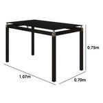 Mesa Malva 107x70 Cm Com Tampo De Vidro Temperado Preto ArtefamolMesa Malva Preto Vidro Preto Temperado 107 Cm Mesa malva com tampo de vidro é ideal para sala de jantar ou cozinha, com design arrojado e super moderno proporcionando otimização ao ambiente. Estrutura em aço de carbono e acabamento em pintura epóxi a pó, com tratamento de fosfatização, garantindo maior resistência a oxidação e fixação da pintura. Composto por uma mesa retangular com tampo em vidro temperado de 5 mm . Ideal para 04 lugares. A mesa suporta até 10Kg distribuídos. Especificações técnicas Cor: Preto Modelo: Malva Material da Estrutura e Tampo: Aço de carbono e vidro temperado de 5 mm Quantidade de Lugares: 4 Formato Retangular Tipo de pé: Fixo Conteúdo da Embalagem: 01 Base de mesa e 01 Tampo Vidro Temperado Dimensões Mesa: Altura: 75 cm Largura: 107 cm Profundidade: 70 cm Dimensões Tampo: Altura: 0,5 cm Largura: 70 cm Profundidade: 110 cm Produto precisa de Montagem: Sim, sugerimos a contratação de um profissional. Instruções e Cuidados: Limpar com pano seco para retirar o pó. Não aplicar produtos abrasivos. Observações Importantes: A Combo Stock não se responsabiliza pela montagem ou desmontagem dos Produtos que deverão ser feitas por um profissional. Estes serviços não estão inclusos nos valores dos mesmos. Pode haver alguma diferença de tonalidade entre a imagem e o produto real, por conta do tratamento de imagens e a calibração de cores do seu monitor. Ao receber a mercadoria, o cliente deve verificar as dimensões e condições da embalagem, caso haja alguma avaria não assine o comprovante de recebimento. Certifique-se de que estão adequados aos elevadores, portas e corredores do local da entrega, visto que NÃO fazemos a montagem, desmontagem do produto e/ou portas e janelas, transporte pela escada ou içamentos pelo lado de fora do prédio. Em casos de Edifícios ou condomínios, o produto será entregue pela transportadora nas respectivas portarias (Porteiros) que deverão ser avisados da entrega pelo comprador. Para quaisquer outras dúvidas entre em contato conosco nos nossos canais de atendimento. As imagens e o ambiente são meramente ilustrativas. Não acompanha acessórios, eletrônicos ou demais móveis ambientadosInformações Técnicas