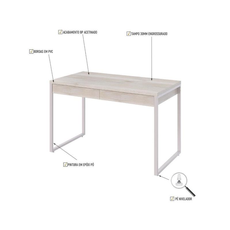 Mesa Office 120x60x75cm C/02 Gavetas Kuadra Snow - Est.brancaSobre o ProdutoMesa Office 120x60x75cm C/02 Gavetas Kuadra Perffect A - Est.BrancaDescrição do Produto:A Mesa Office Kuadra KUME6122 alia design industrial e funcionalidade, perfeita para ambientes de trabalho ou estudo. Seu tampo engrossurado de 30mm, com fita de borda em PVC, proporciona maior durabilidade e excelente acabamento. A estrutura em aço com tubos de 30x20mm, finalizada com pintura epóxi, garante robustez e resistência. Com duas gavetas práticas para organização, e pés niveladores que garantem estabilidade, essa mesa é a escolha perfeita para otimizar espaços com estilo e praticidade.A Linha Kuadra tem seu design com inspiração no estilo industrial, que remete muito a decoração usada nos Lofts das grandes metrópoles nos anos 60 e 70. Harmonizando o metal e os tons de madeira, foram projetados móveis versáteis e com estilo, que podem compor ambientes flexíveis cheios de personalidade, perfeitos para você decorar sua casa ou seu trabalho, tendo um resultado que caminha do estilo rústico ao moderno.Itens Inclusos:1 MesaDimensões dos Produtos (Comp. X Prof. X Alt.):Mesa KUME6122: 120 x 60 x 75cmInformações Logísticas (Comp. X Prof. X Alt.):01 Vol.: 140 x 64,5 x 7cm - 22,874kgTotal Vol.: 1 - Peso Líq. Total: 21,94kg - Peso Total: 22,874kgGarantia: 6 Meses contra defeitos de fabricação.Informações Técnicas / Características:- Cor do Produto: Perffect A - Est.Branca- Material: Mdp- Acabamento: Perffect- Escala de Brilho: Fosco- Fita de Borda: Pvc- Material da Estrutura / Pés: Aço- Acabamento Estrutura: Epóxi-Pó- Possui Gavetas: 2- Tipo da Corrediça: Metálica- Possui Chave: Não- Peso Máximo por Gaveta: 5kg- Possui Pés: 2- Pés Niveladores: Sim- Formato: Retangular- Ambiente Principal: Escritório- Estilo: Industrial- Suporta Até (kg): 40kg- Recomendações de Uso, Manutenção e Limpeza: Para a limpeza, utilize flanela seca ou pano macio levemente umedecido em água. Utilize um pano seco em seguida. Evite contato com produtos químicos (solventes, thinner, acetona, etc) e não utilize nenhum tipo de esponja de aço.- Necessita de Montagem: Sim / Acompanha Manual de Montagem- Complexidade da Montagem: Média: pode ser montado por mais de uma pessoa e/ou necessite de maior conhecimento para montagem.- Observações: Não acompanha acessórios decorativos. Imagens meramente ilustrativas. Baterias são necessárias?: Não | Principais Características do Produto 0: Material MDP | Principais Características do Produto 1: Fita de Borda PVC | Principais Características do Produto 2: Acabamento Estrutura Epóxi-Pó | Cor: Multicolorido | Certificação de teste externa: Não Aplicável | Palavras-chave de Pesquisa: Kuadra | Cômodo indicado: Escritório | Componentes incluídos: Ferragens | Fabricante: Compace | Exige montagem: Sim | Marca: Compace | Quantidade de caixas de embalagem: 1 | Quantidade de itens: 1 | Produto: Mesa | Altura: 75 cm | Largura: 120 cm | Tonalidade: Multicolorido | Peso do Produto: 21.94 | Número da peça: KUME6122 | Número do modelo: KUME6122 | Número de caixas: 1 | Modelo: Kuadra | Profundidade: 60 | Materiais da escrivaninha: Mdp | Requer montagem: Sim | Inclui manual de montagem: Sim | País de Origem: Brasil | Tipo de Garantia: Garantia do Fabricante | Duração da Garantia: 6 Meses | Coleção de Antiguidade: Não | Montagem: Necessita Montagem | Peso do item: value=21.94;unit=kilograms | Dimensões do item P x L x A: width#value=120;depth#unit=centimeters;height#value=75;height#unit=centimeters;depth#value=60;width#unit=centimeters | Cor: Snow - Est.Branca