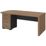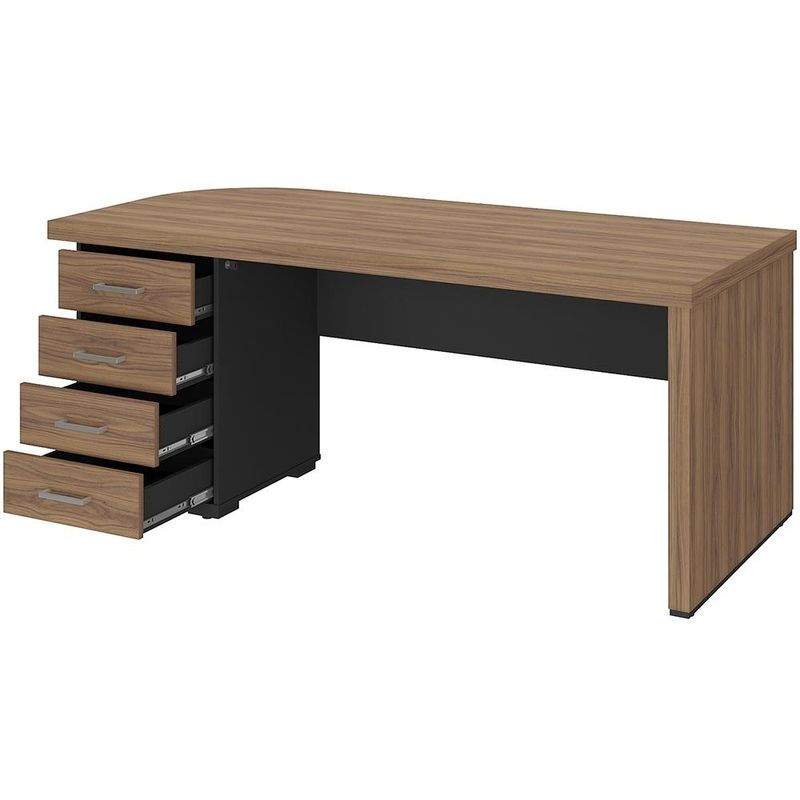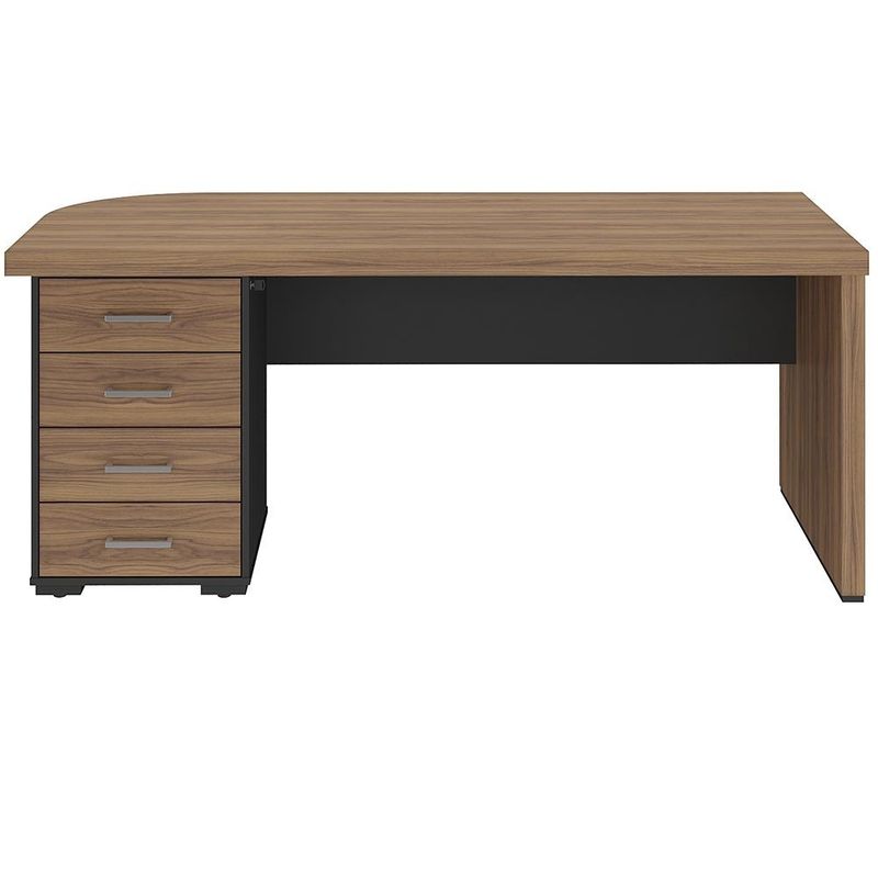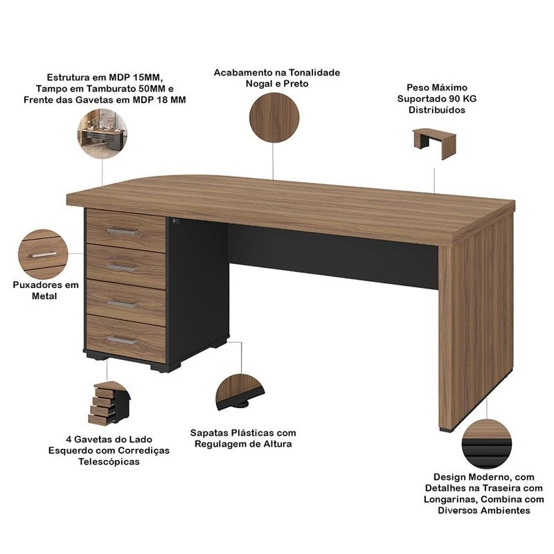 Para quem busca um espaço de trabalho que une design arrojado e organização impecável, a Mesa com Gaveteiro Esquerdo Atria Executiva, da Lyam Decor, é a escolha ideal. A começar pelo tampo curvo que dá um toque de fluidez orgânica ao ambiente, quebrando a rigidez dos móveis tradicionais sem perder o ar profissional. Já o gaveteiro integrado oferece armazenamento inteligente para documentos e materiais, mantendo tudo ao alcance das mãos - mas longe da vista. Essa mesa é versátil, podendo ser aproveita desde escritórios corporativos, que valorizam estética e produtividade, a home office, que exige organização sem comprometer o estilo, como também para ambientes criativos, que se beneficiam de linhas orgânicas e fluidez. Adicione ao seu carrinho e deixe essa mesa transforma seu espaço de trabalho em um verdadeiro statement de bom gosto. Dimensões do produto (L x A x P) 180 x 75 x 80 cm Características: Estrutura em MDP 15mm, tampo em Tamburato 50mm e frente das gavetas em MDP 18mm. Peças na tonalidade Nogal e Preto. Tampo com design curvo, estilo orgânico. 04 Gavetas do lado esquerdo com corrediças telescópicas. Puxadores de metal cromado e chave lateral para travamento das gavetas. Sapatas plásticas com regulagem de altura. Design moderno, com detalhe na traseira com longarinas, combina com diversos ambientes. Peso máximo suportado de 90 kg distribuídos, conforme manual de montagem. - A limpeza deve ser feita com pano levemente umedecido em água limpa, sem esfregar, não utilizar produtos abrasivos, desengordurantes, álcool ou solvente. Observações importantes: - Produto para uso residencial em ambiente interno, não devendo ficar exposto diretamente ao sol, calor e umidade excessivos. - Pode haver alguma diferença de tonalidade entre a imagem e o produto real, por conta do tratamento de imagens e a calibração de cores do seu monitor. - As imagens são meramente ilustrativas, não acompanham objetos de decoração e eletrônicos. - Ao receber a mercadoria, o cliente deve verificar as condições da embalagem, caso haja alguma avaria não assine o comprovante de recebimento. - Montagem, desmontagem e outras instalações serão de responsabilidade do cliente. Não nos responsabilizamos, no ato da entrega, por subir escadas/elevadores ou pelo transporte por guincho em apartamentos. Eventuais despesas são de responsabilidade do comprador. - Confira as dimensões do produto e certifique-se de que passará normalmente por supostos elevadores, portas, escadas e/ou corredores de sua residência.