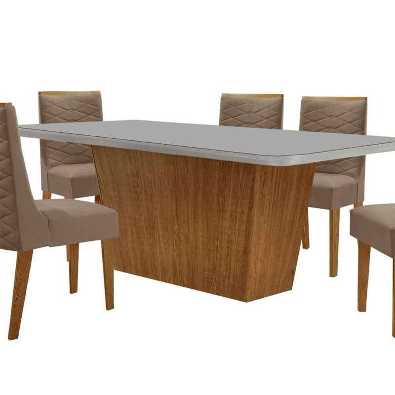Mesa Para Sala De Jantar Aida Com 6 Cadeiras Safira Moderna Vel. Capuccino Off White ImbuiaMesa para Sala de Jantar Aida 180cm MDF Canto Copo com Vidro e 6 Cadeiras SafiraA Sala de Jantar Aida, combinada com as elegantes Cadeiras Safira, e a escolha ideal para quem busca um espaco aconchegante e classico. O conjunto, produzido em MDF, destaca-se pela robustez e pelas linhas retas da base, que trazem um toque de charme contemporaneo. O tampo curvo em vidro nao so embeleza, mas tambem garante mais seguranca, especialmente em lares com criancas. As Cadeiras Safira, com assento e encostos estofados, apresentam detalhes com bordados no encosto tanto na frente quanto atras, elevando o design e o conforto. Juntas, essas pecas criam um ambiente perfeito para momentos inesqueciveis a mesa! Caracteristicas: Marca: Moderna Mobilia Mesa e Cadeiras Tampo Canto Copo Tipo de Acabamento: Pintura UV Material da Estrutura: 100 MDF Possui Vidro: Sim Dimensoes da Mesa: Altura: 80cm Largura: 180cm Profundidade: 90cm Dimensoes das Cadeiras: Altura: 99cm Largura: 45cm Profundidade: 60cm Garantia do Fornecedor: 3 meses Informacoes Importantes: As tonalidades das cores podem sofrer alteracao de acordo com a configuracao de cada monitor. Os objetos que ambientam as fotos nao acompanham o produto. Nao disponibilizamos a montagem do produto. Nao nos responsabilizamos por danos no produto causado por montagem. Verifique as dimensoes do produto e certifique-se que o percurso que ele fara ate o local de uso permite sua passagem. Para mais informacoes confira as politicas de entrega do site. Favor verificar o produto no ato da entrega e em caso de problemas decorrentes no transporte (arranhados, quebra, batida, amassados) deve-se efetuar a ressalva na nota fiscal para conhecimento da transportadora e comunicar imediatamente a loja. Moderna Mobilia reserva o direito de alterar as especificacoes tecnicas sem previo aviso. As medidas contidas no site podem sofrer variacoes de acordo com a montagem, tipo de costura etc.