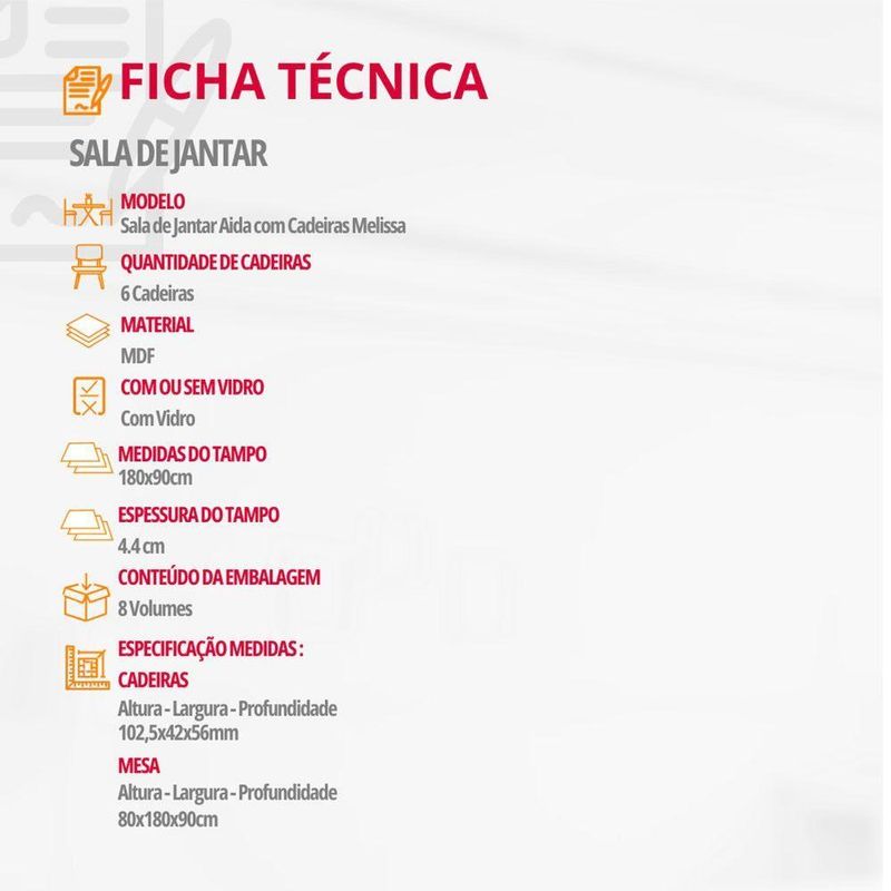 Mesa Sala De Jantar Aida 180cm E 6 Cadeiras Melissa Moderna Veludo Capuccino Off White ImbuiaCom um design sofisticado e contemporaneo, a Sala de Jantar Aida com as Cadeiras Melissa e a escolha perfeita para elevar o ambiente que estiver. As cadeiras, com assentos e encostos estofados, sao adornadas com detalhes em bordados e alcas no encosto, conferindo um charme unico e refinado. A mesa complementa o conjunto com sua base robusta e linhas retas, apresentando um acabamento impecavel que destaca ainda mais a elegancia do espaco. Juntas, essas pecas transformam sua sala de jantar em um ambiente de beleza e estilo inigualaveis!Caracteristicas:Mesa e CadeirasTampo Canto CopoTipo de Acabamento: Pintura UVMaterial da Estrutura: 100 MDFPossui Vidro: SimDimensoes da Mesa:Altura: 80cmLargura: 180cmProfundidade: 90cmDimensoes das Cadeiras:Altura: 102,5cmLargura: 42cmProfundidade: 56cmGarantia do Fornecedor: 03 mesesInformacoes Importantes:As tonalidades das cores podem sofrer alteracao de acordo com a configuracao de cada monitor.Os objetos que ambientam as fotos nao acompanham o produto.Nao disponibilizamos a montagem do produto.Nao nos responsabilizamos por danos no produto causado por montagem.Verifique as dimensoes do produto e certifique-se que o percurso que ele fara ate o local de uso permite sua passagem.Para mais informacoes confira as politicas de entrega do site.Favor verificar o produto no ato da entrega e em caso de problemas decorrentes no transporte (arranhados, quebra, batida, amassados) deve-se efetuar a ressalva na nota fiscal para conhecimento da transportadora e comunicar imediatamente a loja.Moderna Mobilia reserva o direito de alterar as especificacoes tecnicas sem previo aviso.As medidas contidas no site podem sofrer variacoes de acordo com a montagem, tipo de costura etc.