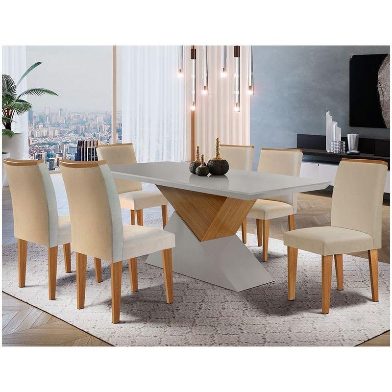 Mesa Aster 180 Tampo Em Mdf Canto Reto Com 6 Cadeiras Lunara Moderna Creme, Off White E ImbuiaQuando o assunto é jantar em casa, você não precisa se preocupar com nada além do cardápio, certo? Então, para que seus convidados se sintam em casa e ainda com aquele bom gosto, adquira o Conjunto de Mesa de Áster, um conjunto completo com tudo o que você precisa para o evento perfeito: 6 cadeiras confortáveis, um design clean, além de um puxador para dar um toque especial de charme; tampo muito bem dimensionado com pintura especial e um design inovador e chamativo. Além do visual moderno, a combinação de cores também resulta em um móvel louvável que será palco de belos momentos.Características:Material: MDFGarantia do Fabricante: 3 mesesInformações Importantes: Não contém vidro. Os objetos que ambientam as fotos não acompanham o produto. Não disponibilizamos a montagem do produto. O produto acompanha manual de montagem. Não nos responsabilizamos por danos no produto causados por montagem de qualquer outra forma que não seja a descrita no manual. Verifique as dimensões do produto e certifique-se que o percurso que ele fará até o local de uso permite sua passagem. A Moderna Mobília reserva o direito de alterar as especificações técnicas sem prévio aviso. As medidas contidas no site podem sofrer variações de acordo com a montagem, tipo de costura etc. As tonalidades das cores podem sofrer alteração de acordo com a configuração de cada monitor.Cor: Cor
