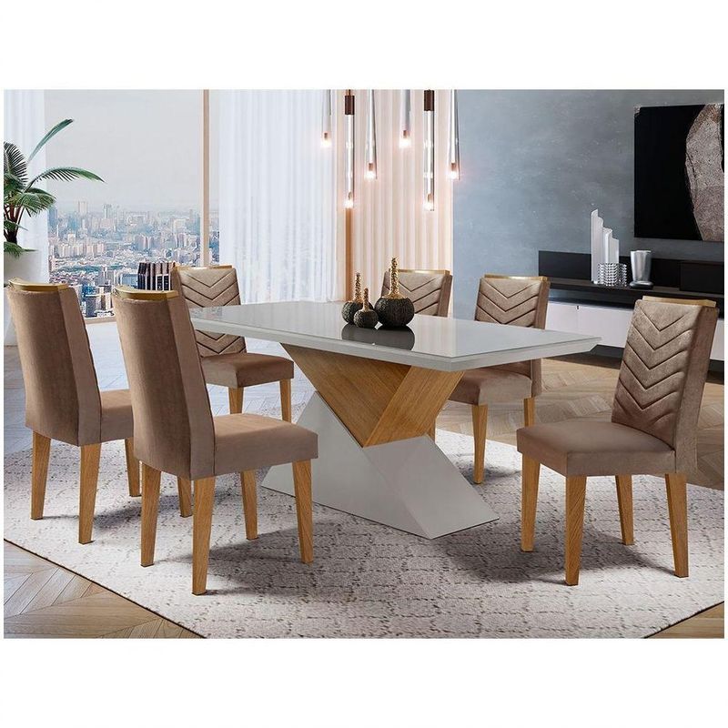 Mesa Aster 180 Tampo Em Mdf E Vidro Com 6 Cadeiras Liz Moderna Marrom, Off White E ImbuiaQuando o assunto é jantar em casa, você não precisa se preocupar com nada além do cardápio, certo? Então, para que seus convidados se sintam em casa e ainda com aquele bom gosto, adquira o Conjunto de Mesa de Áster, um conjunto completo com tudo o que você precisa para o evento perfeito: 6 cadeiras confortáveis, com detalhes de costuras além de um puxador para dar um toque especial de charme; tampo muito bem dimensionado, vidro temperado com pintura especial e design um inovador e chamativo. Além do visual moderno, a combinação de cores também resulta em um móvel louvável que será palco de belos momentos.Características:Material: MDF e VidroGarantia do Fabricante: 3 mesesInformações Importantes: Contém vidro. Os objetos que ambientam as fotos não acompanham o produto. Não disponibilizamos a montagem do produto. O produto acompanha manual de montagem. Não nos responsabilizamos por danos no produto causados por montagem de qualquer outra forma que não seja a descrita no manual. Verifique as dimensões do produto e certifique-se que o percurso que ele fará até o local de uso permite sua passagem. A Moderna Mobília reserva o direito de alterar as especificações técnicas sem prévio aviso. As medidas contidas no site podem sofrer variações de acordo com a montagem, tipo de costura etc. As tonalidades das cores podem sofrer alteração de acordo com a configuração de cada monitor.Cor: Cor
