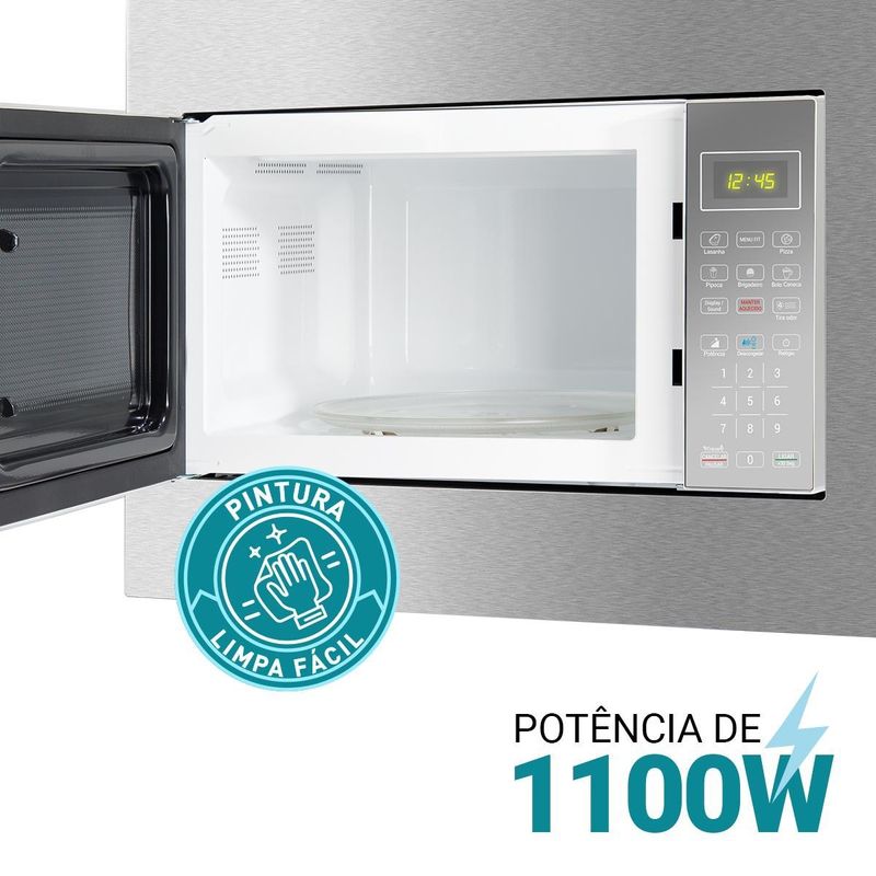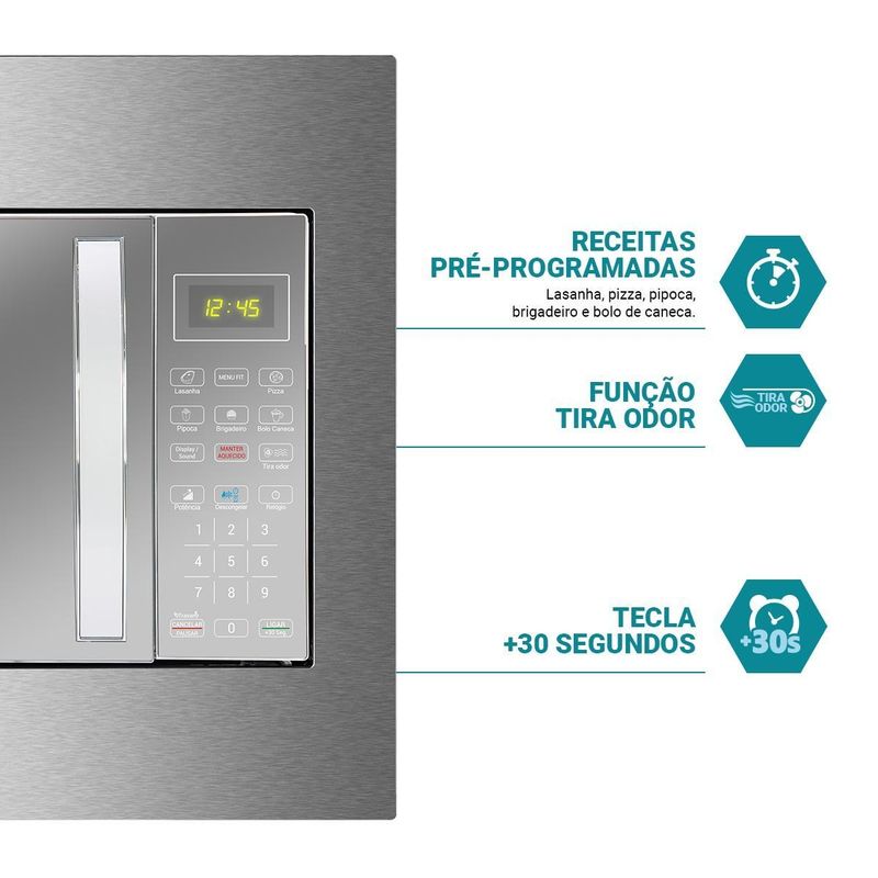 Potente, econômico e versátil, o Micro-ondas de Embutir 28L Philco Limpa Fácil 1400W PMB30E é a escolha ideal para o dia a dia. Com 1400W de potência, oferece agilidade no preparo e aquecimento de refeições, além de funções práticas como Descongelar, +30 segundos e Manter Aquecido. O painel digital do Micro-ondas Philco possui teclas rápidas que facilitam o uso, enquanto a Função Travar garante segurança para famílias com crianças. A Função Tira Odor e a pintura interna Limpa Fácil deixam a higienização muito mais simples e rápida. Com capacidade total de 28 litros (útil de 14L), o Micro-ondas PMB30E acomoda pratos maiores com eficiência, incluindo um prato giratório de 28,5 cm. O Menu Fit e as receitas pré-programadas trazem mais sabor e praticidade às suas escolhas diárias. Além disso, o Micro-ondas Philco 28L Pintura Limpa Fácil 1400W PMB30E conta com Classificação Energética A, que une desempenho e economia. Um micro-ondas completo para quem busca mais tecnologia na rotina.• Potência de 1400W • Capacidade total de 28L / útil de 14L • Prato giratório de 28,5 cm • Pintura interna Limpa Fácil • Classificação energética A • Display digital • Função Descongelar por tempo ou peso • Função +30 segundos • Função Cozinhar por tempo ou peso• Função Manter Aquecido • Função Tira Odor • Função Travar • Display/Sound: desligue o som ou o visor • Receitas pré-programadas – Lasanha, Menu Fit (Sopa, Legume e Batata), Pizza, Pipoca, Brigadeiro e Bolo de Caneca). Nicho: (C) 560mm X (A) 368mm X (P)550 mm