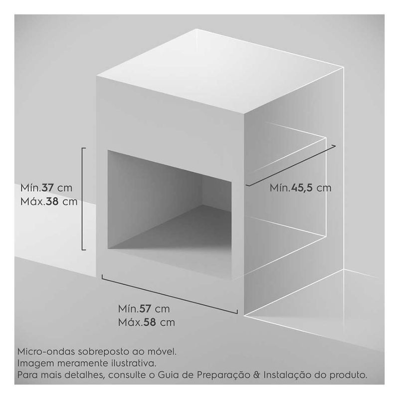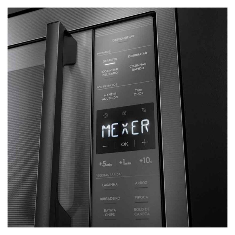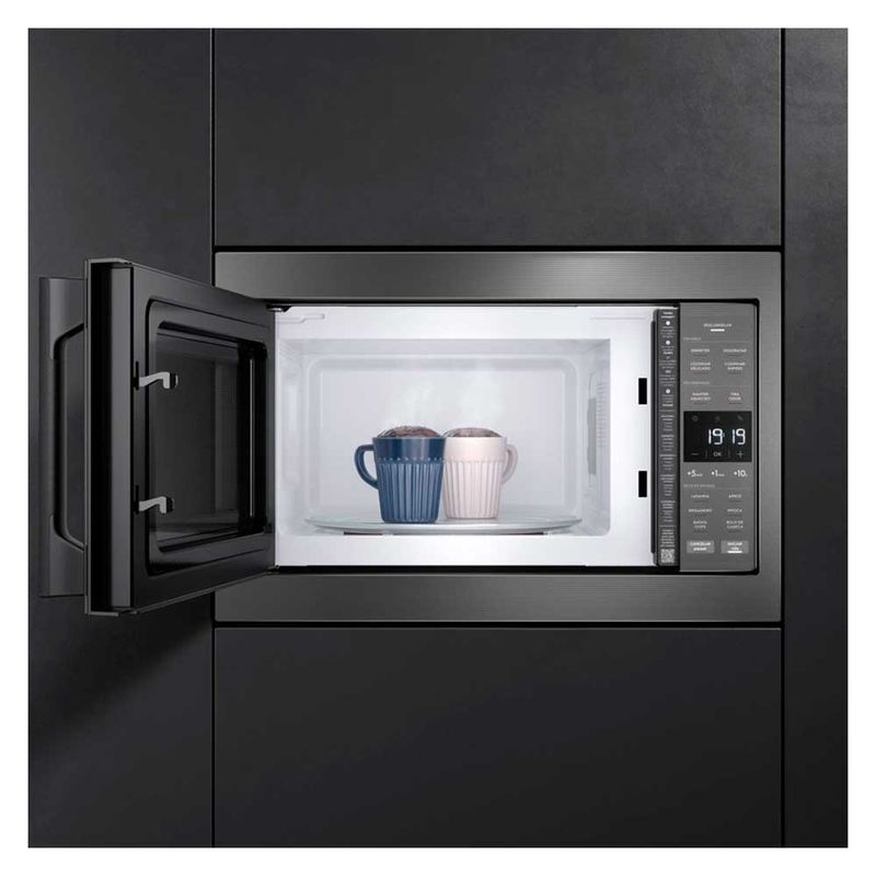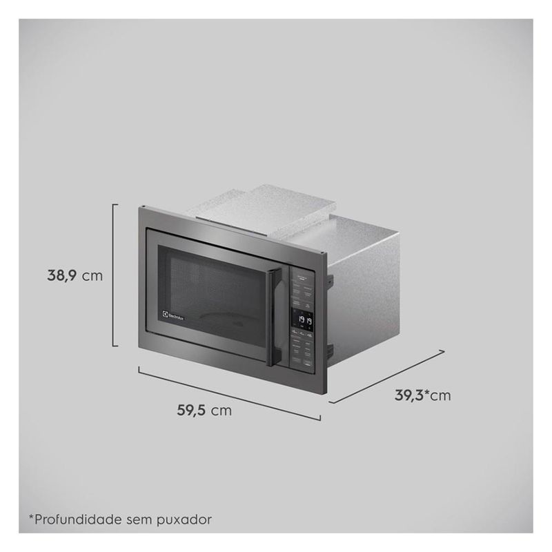 DestaquesNovos modos de preparoOferece praticidade no seu dia a dia com quatro funções de preparo disponíveis no painel, Derreter, Desidratar, Cozinhar Rápido e Cozinhar Delicado.Derreterfacilita o processo de derretimento do alimento, de forma mais uniforme.Desidratardesidrata os alimentos de forma precisa. Cozinhar delicadobons resultados no cozimento para que o alimento fique no ponto ideal. Cozinhar rápidotenha mais sabor e agilidade no preparo dos alimentos. Descongelamento AssistidoNova tecnologia de Descongelamento Assistido Electrolux que permite resultados mais uniformes através das orientações mexer ou virar no painel.Função Manter AquecidoMantenha o prato aquecido até a hora do consumo para você aproveitar o melhor de cada refeição.Função Tira OdorGraças ao sistema de recirculação do ar interior, suaviza os odores deixados por preparos anteriores e mantém o micro-ondas sempre pronto para a próxima receita. Seis Receitas Pré ProgramadasOferece a praticidade que sua rotina merece. Com apenas um toque, faça lasanha, arroz, brigadeiro, pipoca, batata chips e bolo de caneca no tempo e potência ideais.Função Economia de EnergiaAo ativar essa função, o micro–ondas desligará a luz do painel automaticamente quando não estiver em uso. Função Trava PainelGarante que o painel não seja acionado ou alterado indevidamente por crianças, por exemplo. Função MudoConfigure seu micro-ondas para não emitir som e mantenha o ambiente silencioso e agradável sempre que quiser. "CaracterísticasTipo: Embutir06 Pratos Pré-programadosPainel Eletrônico: Touch VidroFunção de Pratos Pré ProgramadasPorta Espelhada: Glass + PlasticPrato GiratórioLuz InternaRelógioTimerEspecificações TécnicasModelo: ME3BCCor: CinzaCapacidade Total: 34 litrosPotência: 1400 WSelo Procel (Eficiência Energética): A ClassAcabamento: Pintado / Branco (Cor externa preto)Voltagem: 110V ou 220V (não é bivolt)EAN: 10347DBA185 (110V) / 10347DBA285 (220V)Garantia: 12 mesesDimensões Nicho:Dimensões do Nicho (mm) - Altura Interna Minima -370 mm / Dimensões do Nicho (mm) - Altura Interna Maxima 380mm / Dimensões do Nicho (mm) - Largura Interna Minima 570 mm / Dimensões do Nicho (mm) - Largura Interna Maxima 580mm / Dimensões do Nicho (mm) - Lagura para produto alinhado com nicho 600m / Dimensões do Nicho (mm) - Altura para produto alinhado com nicho 395mm/ Dimensões do Nicho (mm) - Profundidade minima 455mm/ Dimensões do Nicho (mm) - saída de ar Minima 50mmDimensões e PesoDimensões do produto sem embalagem (AxLxP): 389x595x393 mmDimensões do produto com embalagem (AxLxP): 425x625x474 mmPeso do produto sem embalagem: 16,2 kgPeso do produto com embalagem: 16,7 kgItens Inclusos01 MicroondasManual de instruçõesServiço de Instalação e Orientação de UsoPara sua comodidade e segurança, a Fast Shop dispõe do serviço de Instalação e Orientação de Uso*. Agendamos o serviço para você, executamos a instalação com equipes próprias especializadas e autorizadas pelo fabricante, ensinamos como utilizar os produtos da melhor forma e temos uma área de qualidade para acompanhar e garantir que tudo dê certo. É rápido e fácil. Você pode contratar o serviço com o nosso Televendas pelo tel.: 3003-3278 ou em uma de nossas lojas. Consulte os valores e regiões atendidas.* Verifique com nossos vendedores se a Fast Shop realiza a instalação desse produto.