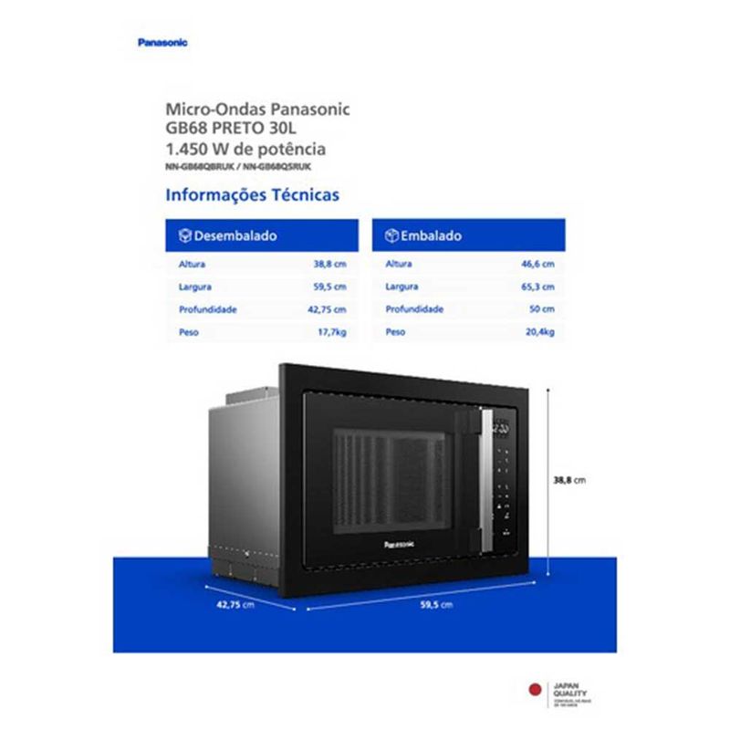 Micro-ondas de embutir com capacidade 30L, design premium integrado, cavidade em inox, painel easy touch, grill, função desodorizador. CaracterísticasTipo: EmbutirFunção GrillPainel Eletrônico: TouchTimerFunção desodorizador Especificações TécnicasModelo: NN-GB68QSRUKCor: InoxCapacidade: 30 litrosPotência: 1450WNível de Potência: 10Consumo de Energia: 1,45 kWhSelo Procel (Eficiência Energética): BAcabamento: Aço, Plástico e VidroPrato Giratório Luz InternaVoltagem: 220VEAN: 7896067222645Garantia: 12 meses Dimensões e PesoDimensões do produto sem embalagem (AxLxP): 388x595427,5 mmDimensões do produto com embalagem (AxLxP): 466x653x500,0 mmPeso do produto sem embalagem: 17,70 KgPeso do produto com embalagem: 20,40 Kg Itens Inclusos01 Micro-ondas Serviço de Instalação e Orientação de UsoPara sua comodidade e segurança, a Fast Shop dispõe do serviço de Instalação e Orientação de Uso*. Agendamos o serviço para você, executamos a instalação com equipes próprias especializadas e autorizadas pelo fabricante, ensinamos como utilizar os produtos da melhor forma e temos uma área de qualidade para acompanhar e garantir que tudo dê certo. É rápido e fácil. Você pode contratar o serviço com o nosso Televendas pelo tel.: 3003-3278 ou em uma de nossas lojas. Consulte os valores e regiões atendidas.* Verifique com nossos vendedores se a Fast Shop realiza a instalação desse produto.